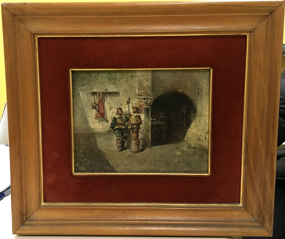 Firma indecifrata "Interno con guardie" olio su tavola (cm 14x18) Firmato in basso a destra. In cornice