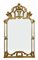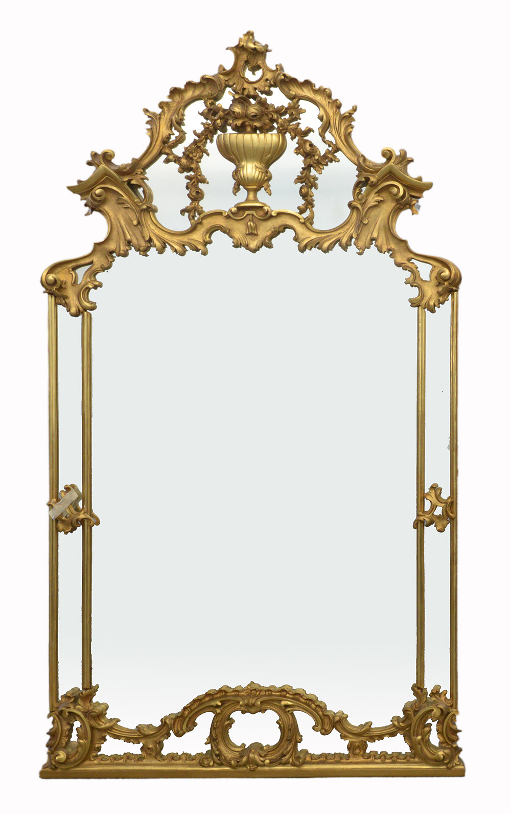 Caminiera in legno intagliato e dorato a motivi vegetali, volute e vaso con fiori, specchio tripartito (cm 197x112) (difetti)