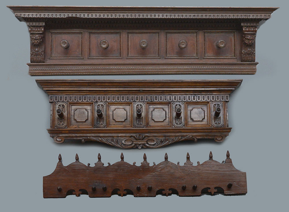 Lotto composto da tre appendiabiti da parete in legno intagliato (difetti)