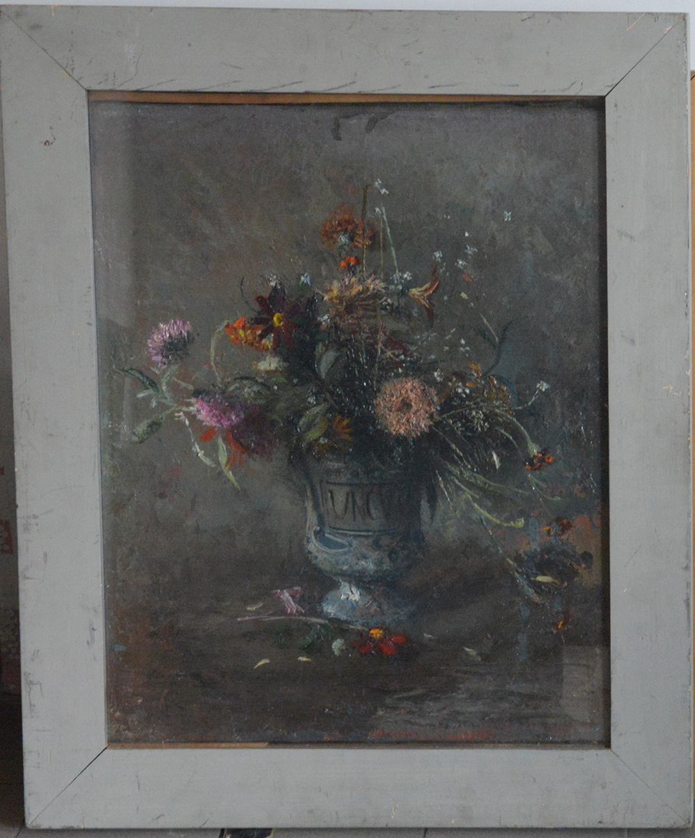 "Fiori" olio su tela (cm 62x50) eAl retro: cartiglio della Galleria d'arte Ranzini di Genova con data 1951. In cornice (difetti)
