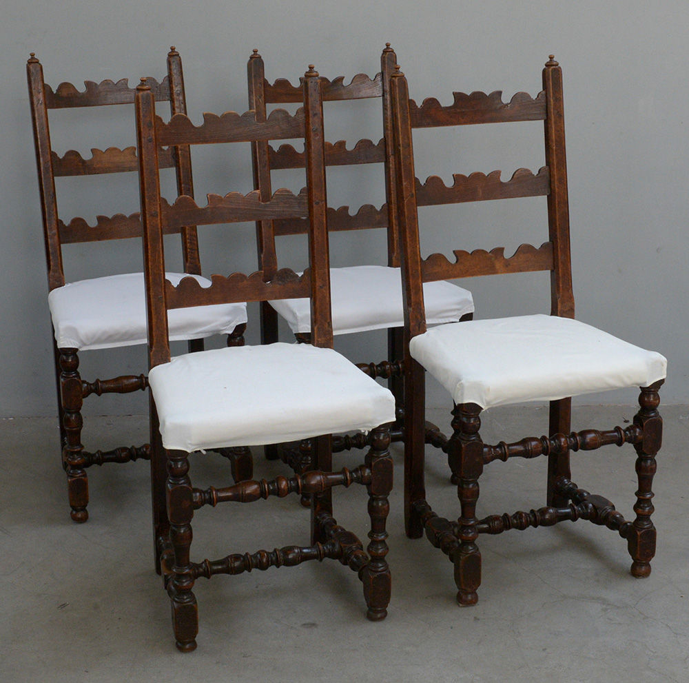 Quattro sedie a rocchetto con schienale decorato da fasce sagomate, secolo XVII (difetti e restauri)