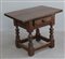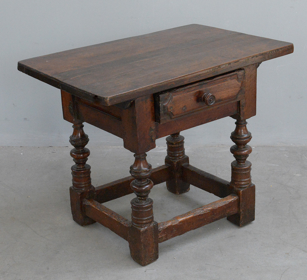 Antico tavolino ad un cassetto sottopiano e gambe tornite riunite da traverse (cm 77x62x50) (difetti)