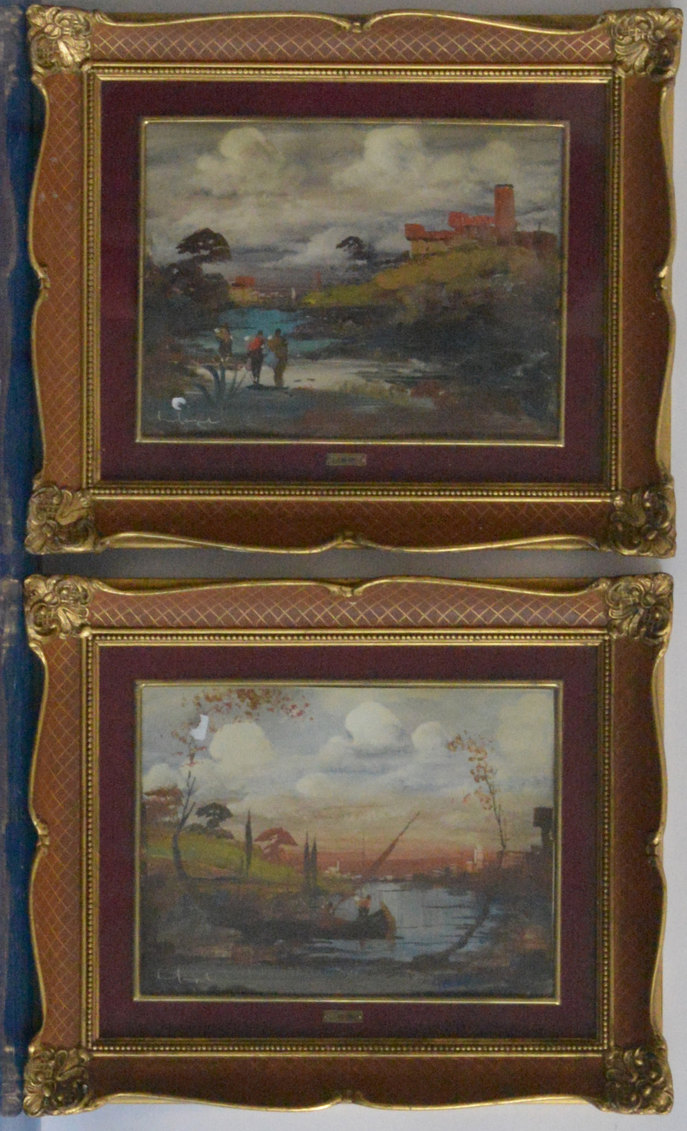 Coppia di dipinti ad olio raffiguranti "Paesaggi" (cm 17.5x24.5) Firmati in basso a sinistra. In cornici (difetti)