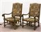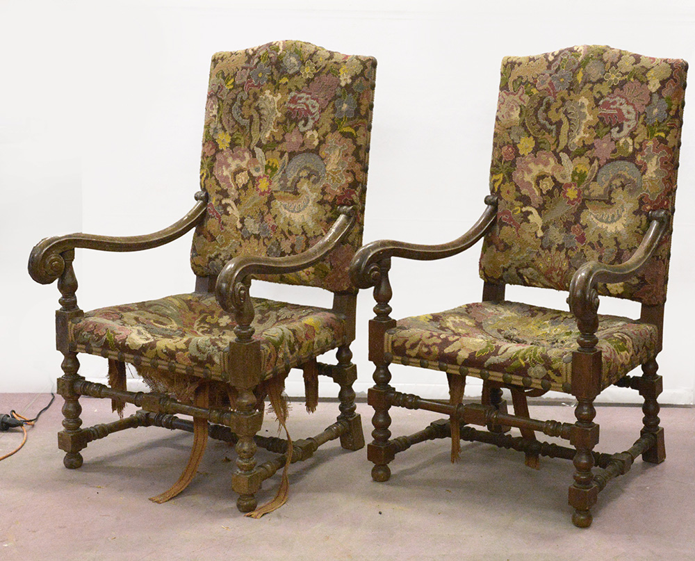 Coppia di poltrone in stile con braccioli sagomati terminanti a ricciolo, gambe e traverse tornite. Rivestite con tessuto ad arazzo (gravi difetti)