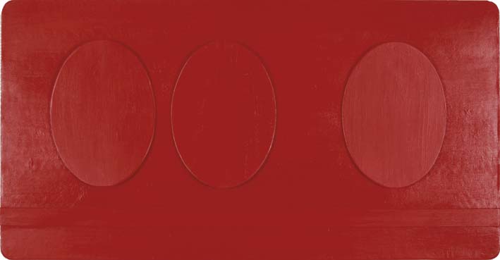 LORENZO PIEMONTI Milano 1935 In tre nel rosso 1966 idropittura su tavola, 49,5x95 firma e data al retro autentica dell'Autore su foto provenienza etichetta e timbro dell'Autore al retro