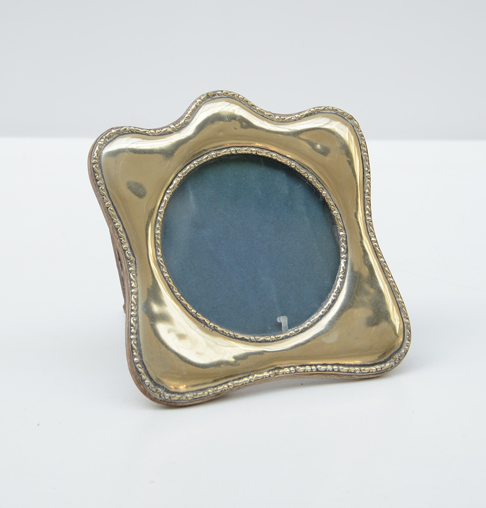 Cornice da tavolo in argento di forma sagomata. Bordo decorato a piccole perline e volute (cm 15x15) (difetti)