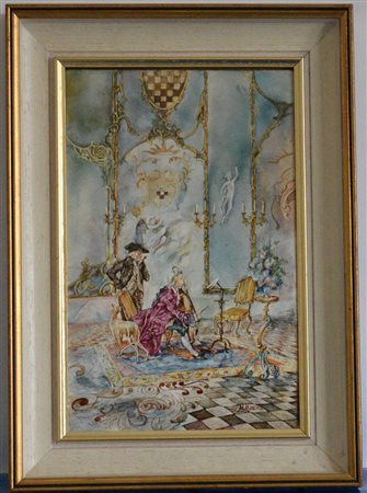 Piastrella dipinta raffigurante la "Lezione di violoncello" di Mosé Bianchi (cm 43x27), in cornice (difetti)