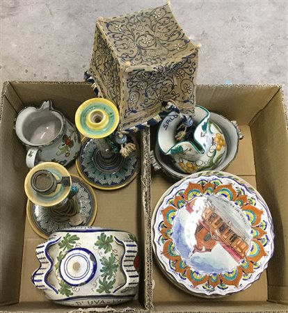 Manifatture del centro Italia, lotto di due cartoni contenenti numerosi oggetti per la tavola in ceramica dipinta in policromia (gravi difetti)
