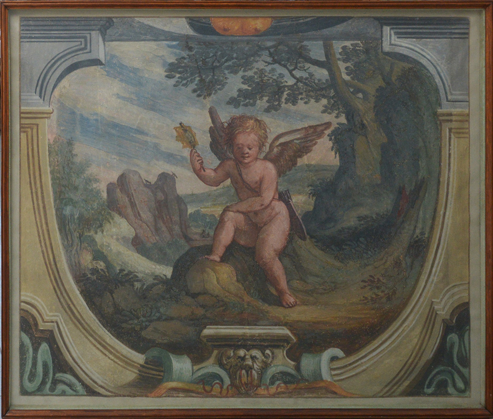 Ignoto del secolo XX "Putto in un paesaggio" strappo d'affresco (cm 117x139) In cornice (difetti)