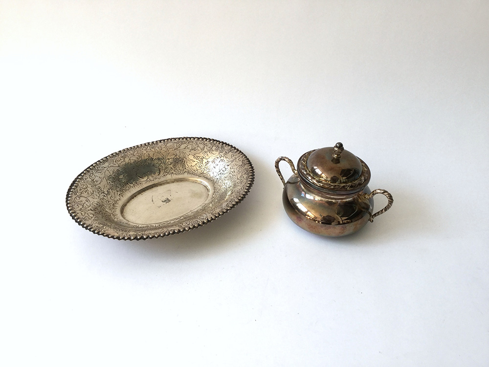 Lotto composto da un vassoietto con tesa sbalzata e una zuccheriera biansata in argento, (gr 560 ca)