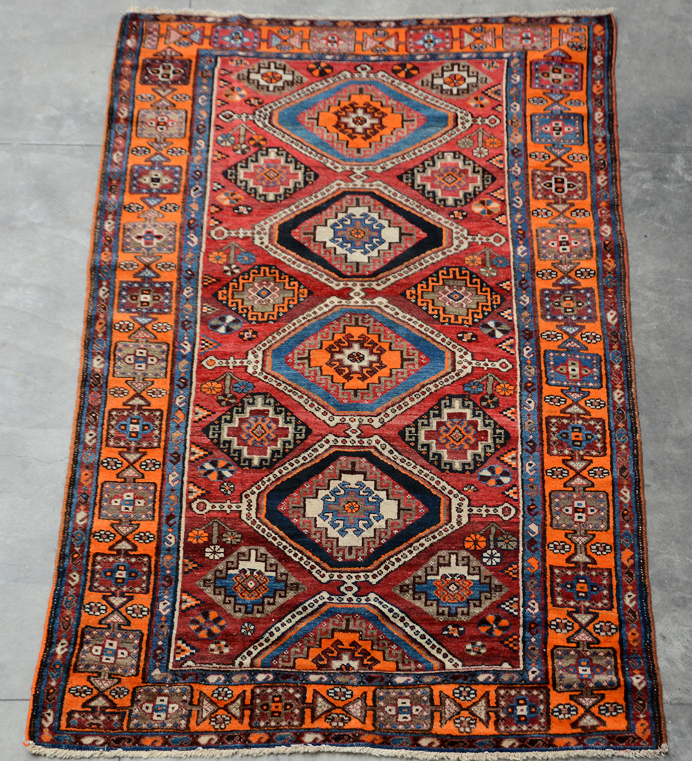 Tappeto Karabagh, Caucaso inizio secolo XX. Decoro con quattro medaglioni romboidali nei toni del bianco, arancio e blu su fondo bordeaux (cm 232x135) (difetti)