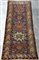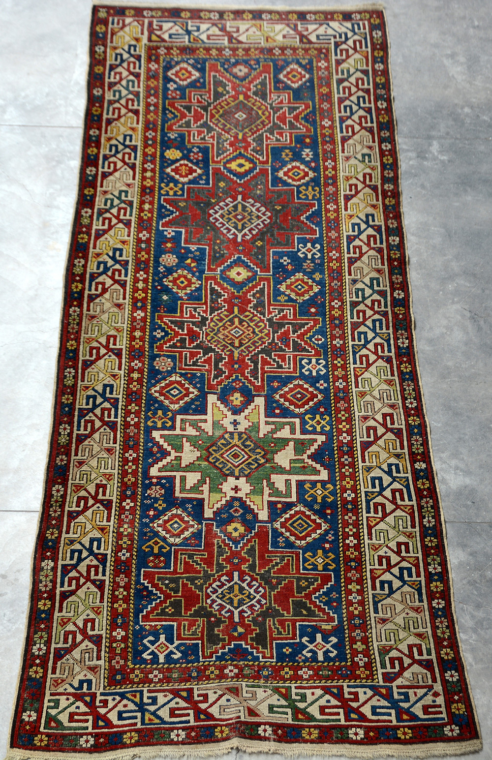 Tappeto Gandjiè, Caucaso inizio secolo XX. Decoro Lesghi con cinque medaglioni nei toni del rosso, verde e marrone su fondo blu (cm 317x120)(difetti, rapature e restauri)