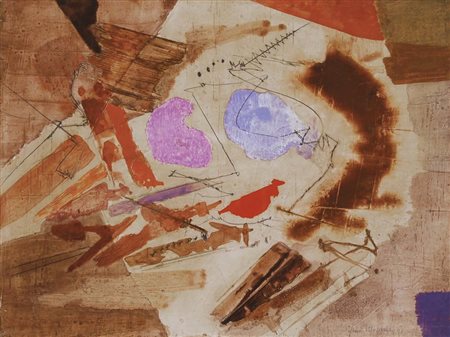 GINO MORANDIS Venezia 1915 - 1995 senza titolo 1963 tecnica mista su tavola, 30x40 firma e data in basso a destra e al retro autentica dell'Archivio Storico Artisti Veneti nr. Rep. 34/05/M - A.M. 21 su foto esposizioni Centro d'Arte La Roggia Conegliano - etichetta al retro