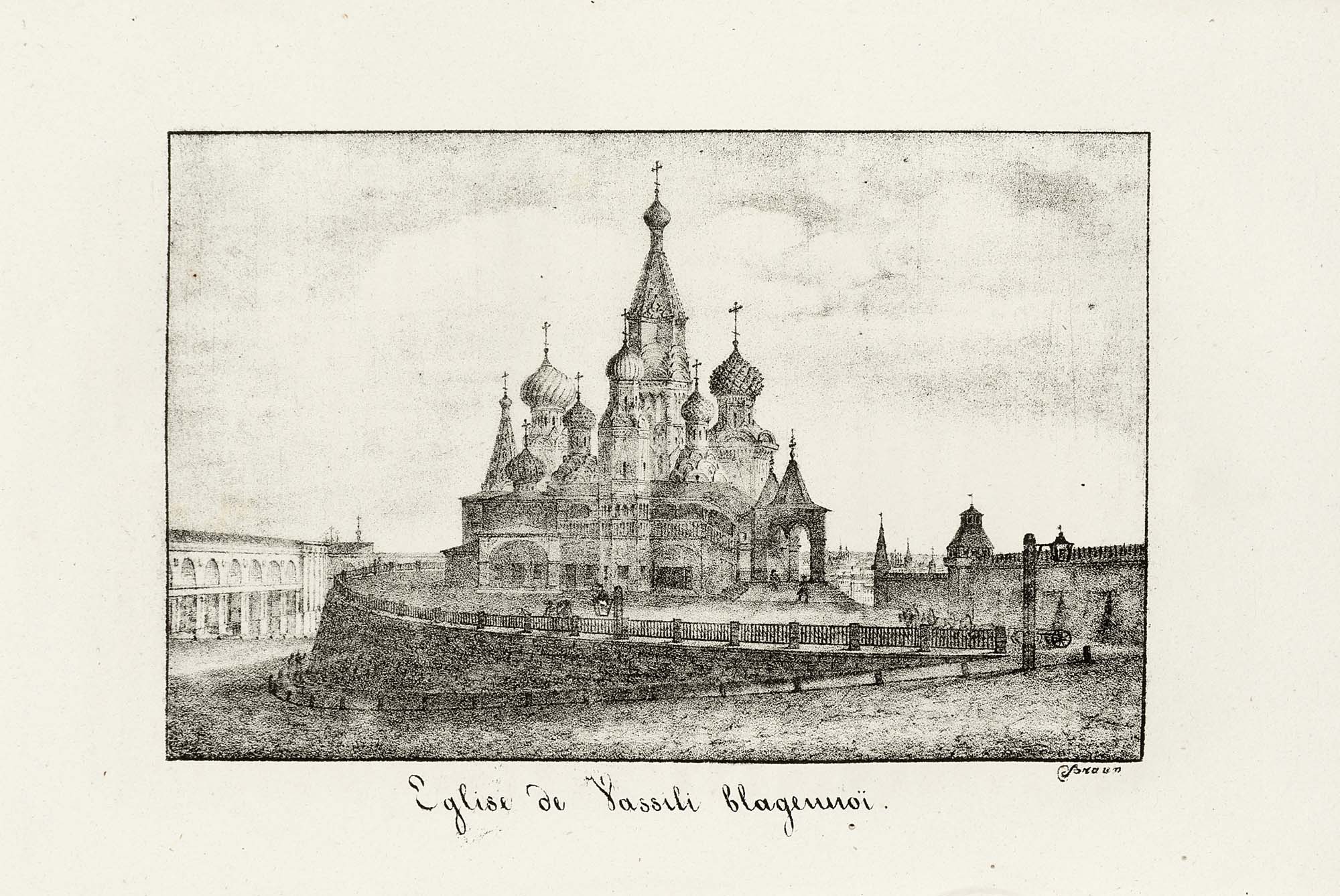 LAVEAU, Georges De (inizio XIX secolo) - Guide du voyageur à Moscou. Mosca: L'Imprimerie d'Auguste Semen, 1824.Prima edizione di questa guida dettagliata di Mosca con alcune belle tavole litografiche. De Levau fu segretario della Società Imperiale dei Naturalisti di Mosca e conosceva personalmente la città russa. Nei 12 capitoli ne descrive la storia, la topografia, il commercio, i monumenti e le istituzioni corredando il tutto da dati statistici dettagliati. Nel settimo capitolo descrive le collezioni private e le biblioteche inclusa quella del Principe Michel Galitzin proprietario di una Bibbia di Gutenberg.8vo (236 x 150mm). Occhiello, antiporta incisa in rame, 4 tabelle ripiegate e 7 tavole litografiche rappresentanti monumenti della città (fioriture diffuse e alcuni tarli al margine interno tra le pp. 345-356). Brossura editoriale marrone stampata in nero, in barbe (alcune perdite al margine inferiore del dorso, macchie di polvere).-ENLAVEAU, Georges De (inizio XIX secolo) - Guide du voyageur à Moscou. Moscow: L'Imprimerie d'Auguste Semen, 1824.First edition of a detailed guide to Moscow, illustrated with finely lithographic plates. Lecointe de Laveau, a French entomologist, was secretary of the Imperial Society of Naturalists of Moscow and had a first-hand knowledge of the city. In 12 chapters he describes Moscow's history, topography, commerce, monuments, and institutions, with (folding) tables providing valuable statistic data. The seventh chapter contains details on public and private art collections and libraries, including the library of Prince Michel Galitzin, who owned a Gutenberg Bible.8vo (236 x 150mm). Half-title, engraved frontispiece, 4 folding tables and 7 lithographic plates depicting the monuments of the city (some spotting, some worming between pp. 345-356). Brown editorial wrappers printed in black, uncut (some loss to spine, some soiling).
