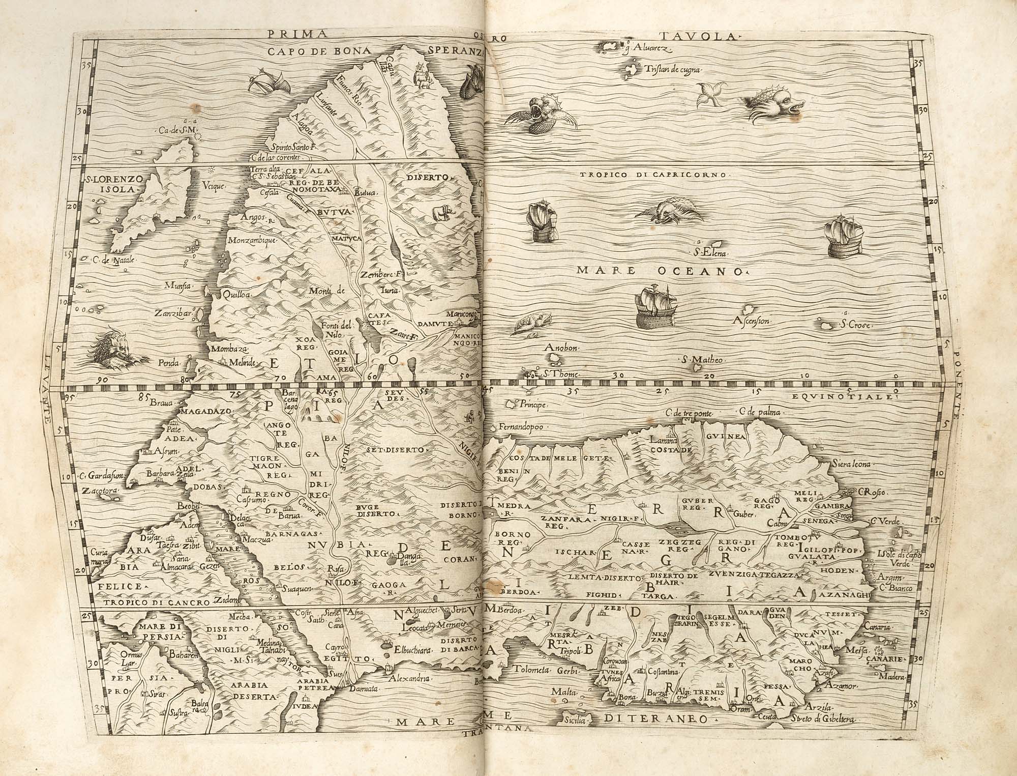 RAMUSIO Giovan Battista (1485-1557) - Delle navigationi et viaggi (volume primo). Venezia: Giunti, 1606.Copia da studio del primo volume di questo fondamentale testo per la storia delle esplorazioni che raccoglie numerosi resoconti di esploratori antichi e contemporanei.Folio (320 x 218mm). Mappa dell'Africa a doppia pagina fuori testo, numerose xilografie nel testo (mancano 2 mappe e le carte 2n e 2n8 sostituite dalla 2n3 e 2n6 ripetute, qualche brunitura e macchia, macchia di inchiostro al margine superiore della carta 2ii8). Legatura coeva in piena pergamena, titolo manoscritto al dorso, antica posizione di scaffale su cartellino (qualche difetto e piccole mancanze alle giunture dei piatti).-ENRAMUSIO Giovan Battista (1485-1557) - Delle navigationi et viaggi (volume primo). Venice: Giunti, 1606.A fundamental text for the history of exploration.Folio (320 x 218mm). Double-page engraved map of Africa, numerous woodcuts (lacking 2 maps and 2n and 2n8 substitute by 2n3 and 2n6 repeated twice, some browning and staining, ink stain at top margin of 2ii8). Contemporary vellum, manuscript title on spine, old label with shelfmark (some rubbing, joint lightly chipped).