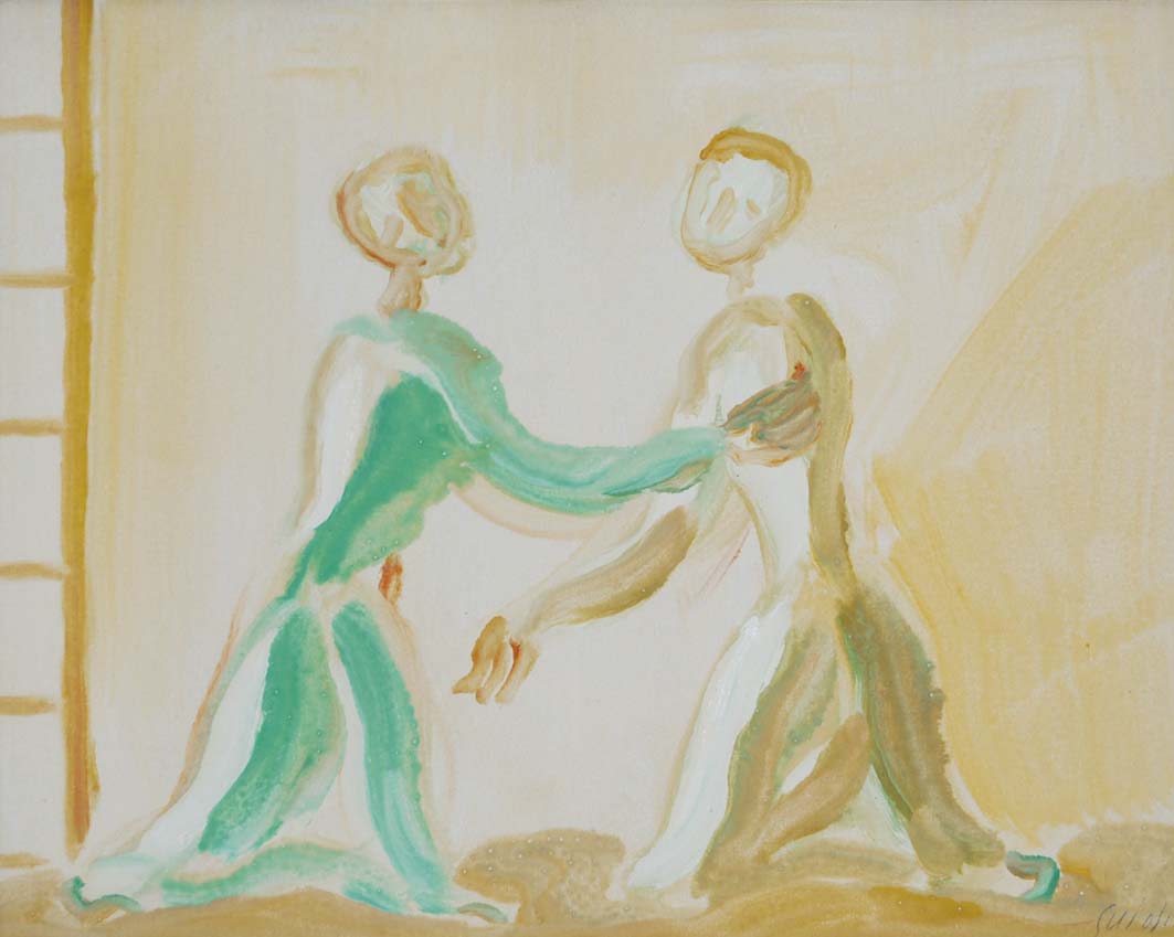 VIRGILIO GUIDI Roma 1892 - Venezia 1984 Incontro 1969 olio su tela, 40x50 firma in basso a destra firma data titolo e dedica ad personam al retro Bibliografia Catalogo Generale Virgilio Guidi ed. Electa vol. III pag. 1087 tav. 1969 358 autentica dell'Autore su foto