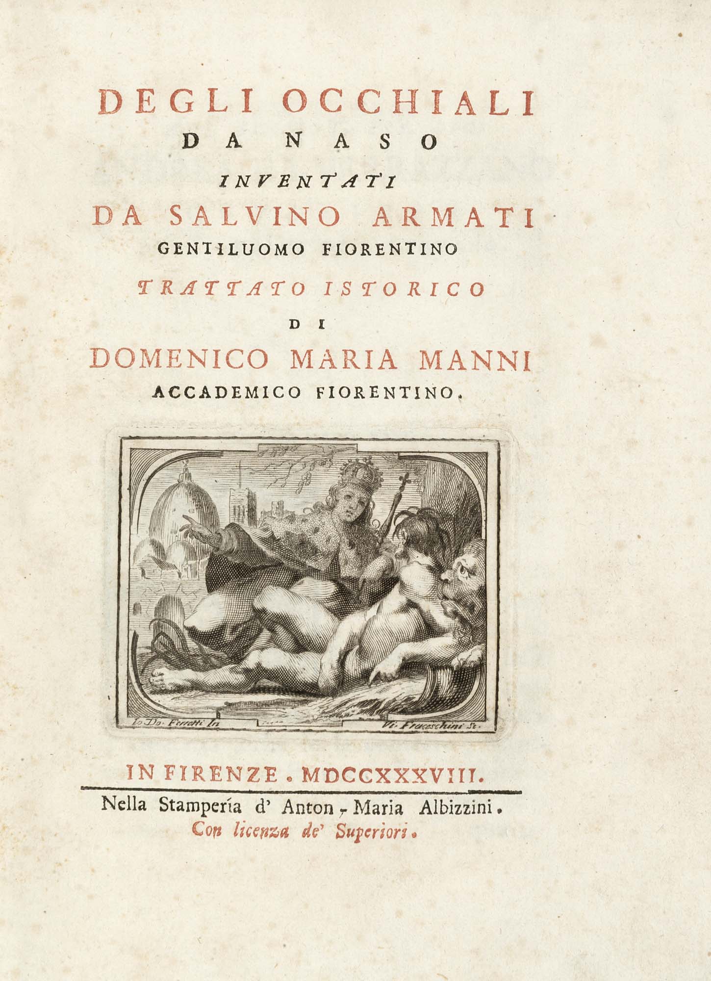 MANNI, Domenico Maria (1690-1788) - Degli occhiali da naso inventati da Salvino Armati. Firenze: Anton Maria Albizzini, 1738 (ma con l'aggiunta del 1741).Prima edizione, probabilmente la seconda tiratura con le aggiunte menzionate all'occhiello datato 1741. Questo celebre testo fu il primo a raccontare la storia degli occhiali da vista.4to (222 x 167mm). Frontespizio in rosso e nero con vignetta calcografica incisa da V. Franceschini e disegnata da G.D. Ferretti, iniziali e fregi xilografici, occhiello inserito prima dell'inizio del testo e con titolo "Trattato istorico degli occhiali da naso con aggiunta fatta l'anno 1741" (alcune lievi fioriture). Cartone coevo, titolo manoscritto al dorso.-ENMANNI, Domenico Maria (1690-1788) - Degli occhiali da naso inventati da Salvino Armati. Florence: Anton Maria Albizzini, 1738 (ma con l'aggiunta del 1741).First edition, probably the second issue with the 1741 additions mentioned on the half-title. ‘The first book on the history of spectacles. Manni gave credit for the invention to the Florentine Armati’ (Garrison and Morton).4to (222 x 167mm). Title printed in red and black, engraved vignette by V. Franceschini after G.D. Ferretti, woodcut historiated initials, with half-title dated 1741 bound before text (some light spotting). Contemporary boards, manuscript title on spine.
