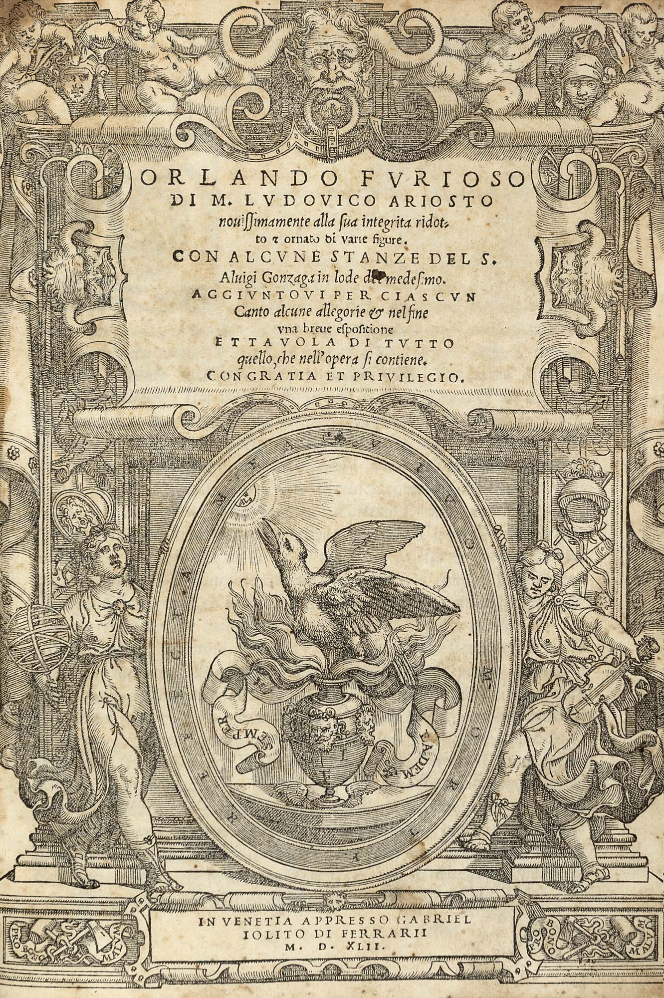 ARIOSTO, Ludovico (1474-1533) - Orlando Furioso.. Espositione di tutti i vocaboli et luoghi difficili.. raccolte da M. LODOVICO DOLCE. Venezia: Gabriel Giolito Ferrari, 1542.Prima edizione del Giolito di questa pregiata versione illustrata del celebre poema dell'Ariosto. L’apparato figurativo e interpretativo contribuì al successo del poema e alla sua definitiva canonizzazione tra i classici della letteratura europea.4to (208 x 146mm). Elaborato frontespizio inciso in legno che racchiude la marca tipografica ripetuta in fine al volume e all'inizio dell'Espositione, numerosissime illustrazioni xilografiche e capilettera, ritratto dell'Ariosto da Tiziano al verso di 2K4 (frontespizio appena tagliato al margine esterno e con lievi fioriture che continuano alle prime e ultime pagine, poche altre lievi macchie). Marocchino marrone del XIX secolo decorato in oro ai piatti, dorso e tagli (piatto anteriore staccato). Provenienza: La Bibliofila (etichetta di libraio).-ENARIOSTO, Ludovico (1474-1533) - Orlando Furioso.. Espositione di tutti i vocaboli et luoghi difficili.. raccolte da M. LODOVICO DOLCE. Venice: Gabriel Giolito Ferrari, 1542.The first Giolito edition of the renown poem by Ariosto in this fine illustrated version which contributed to the definitive establishment of Orlando Furioso as one of the classic text of European literature.4to (208 x 146mm). Title within elaborate woodcut border around the printer's device which is repeated at the beginning of the Esposizione and at end, numerous woodcut illustrations and initials, portrait of Ariosto after Titian on verso of 2K4 (frontispiece just a touch cropped at outer margin with some light foxing continuing in first leaves and at tend, some other occasional light stains). 19th-century brown morocco decorated in gilt on front panels, spine and edges (front panel detached). Provenance: La Bibliofila (bookseller's ticket).