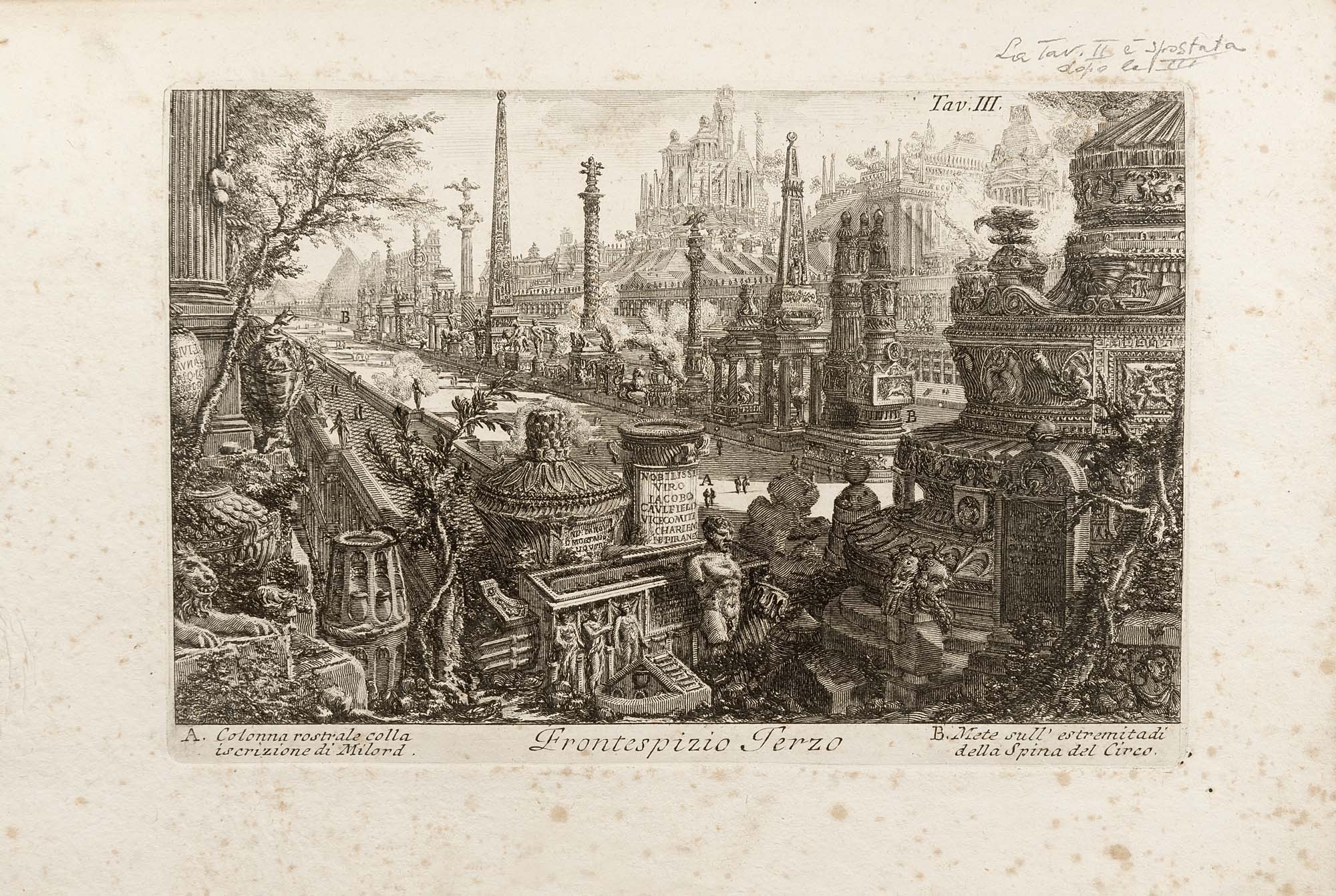 PIRANESI, Giovanni Battista (1720-1778) - Lettere di giustificazione scritte a Milord Charlemont e a di lui agenti di Roma..intorno la dedica della sua opera delle Antichità Rom[ane] fatta allo stesso signor ed ultimamente soppressa. Roma: [G.B. Piranesi], 1757.Interessante opera di polemica in cui Piranesi attacca James Caulfeild, visconte di Charlemont (1728-1799) colpevole di non aver patrocinato, come promesso, la pubblicazione delle "Antichità Romane" (1756). Il volume, distribuito privatamente ad amici e primi acquirenti, oltre a spiegare il dissidio, illustra in che modo venne cancellato il nome del patrocinante dalle tavole dedicatorie. Vengono infatti riprodotte, in formato ridotto, le incisioni originarie con le dediche iscritte su delle epigrafi di invenzione e le stesse con il nome di Charlemont abraso. Nel farlo, Piranesi, fedele al gusto antiquario, simulò le tecniche usate dagli antichi per rimuovere i nomi dei colpiti da damnatio memoriae dai monumenti.4to (275 x 190mm). Frontespizio inciso (rimontato) 7 tavole (su 8, manca la tavola IV), 5 vignette calcografiche. Frontespizio nella versione recante la citazione da Ennio (occhiello dedicatorio mancante, fioriture ai margini delle tavole). Legatura coeva in carta stampata.-ENPIRANESI, Giovanni Battista (1720-1778) - Lettere di giustificazione scritte a Milord Charlemont e a di lui agenti di Roma..intorno la dedica della sua opera delle Antichità Rom[ane] fatta allo stesso signor ed ultimamente soppressa. Rome: [G.B. Piranesi], 1757.Piranesi's rare polemic, which disowned Lord Charlemont's patronage and set out Piranesi's own view of the relationship between artist and patron. The Irish nobleman and politician James Caulfield, first Earl of Charlemont (1728-1799), was a patron of the arts, chairman of the committee of the Dilettanti Club and friend of Burke, Johnson, Reynolds, Goldsmith and Hogarth. Educated privately, he went on the Grand Tour at the age of eighteen in 1746, travelling to Turin (where he resided for a year, making the acquaintance of David Hume), Rome, the Greek Islands, Constantinople, the Levant, and Egypt, before returning to Ireland in 1754. Piranesi"s Camera sepolcrali degli antichi romani le quali esistono dentro e fuori di Roma (ca 1750) was published as a prospectus to secure a patron, and Charlemont responded. Piranesi engraved a large number of additional plates, and -- having secured a promise of further subventions from Charlemont to offset the significant financial outlay involved -- added them to the work, publishing the four-volume set under the title Le Antichita romane in 1756. However, by this point Charlemont had returned to Ireland and, despite repeated requests from Piranesi, did not provide the artist with the anticipated payment but only a sum of less than 200 scudi, a figure which Piranesi dismissed as offensively small (in contrast, the Pope had given 1,200 scudi without any expectation of a dedication). In frustration and anger, Piranesi removed the dedications to Charlemont present in the first states of the title-pages to the work, and scrupulously expunged all references to his erstwhile patron from the text. Piranesi published the Lettere di giustificazione the following year, which reprints two of the artist's letters to Charlemont together with a third to Father Peter Grant, who had attempted to intervene in the dispute and mediate between the two parties. The textual vindication of his position is complemented by the series of eight plates which demonstrate the disassociation of Charlemont's patronage from the work in a relentlessly methodical manner; they illustrate the original title-pages with their dedications to Charlemont, two versions of Charlemont's text for the dedication leaf, the first title with the dedicatory text erased, and, finally, the second state of the title-page with the revised dedication. As Wilton-Ely states, "the intellectual and social changes of the late 18th century affected the traditional relationship between patron and artist, and the Lettere are symptomatic of issues greater than a mere personal quarrel.4to (275 x 190mm). Engraved titlepage (mounted) 7 plates (of 8, lacking plate IV), 5 engraved calcographic vignettes (missing dedication leaf, spotting to the margins of plates). Contemporary printed wrappers.