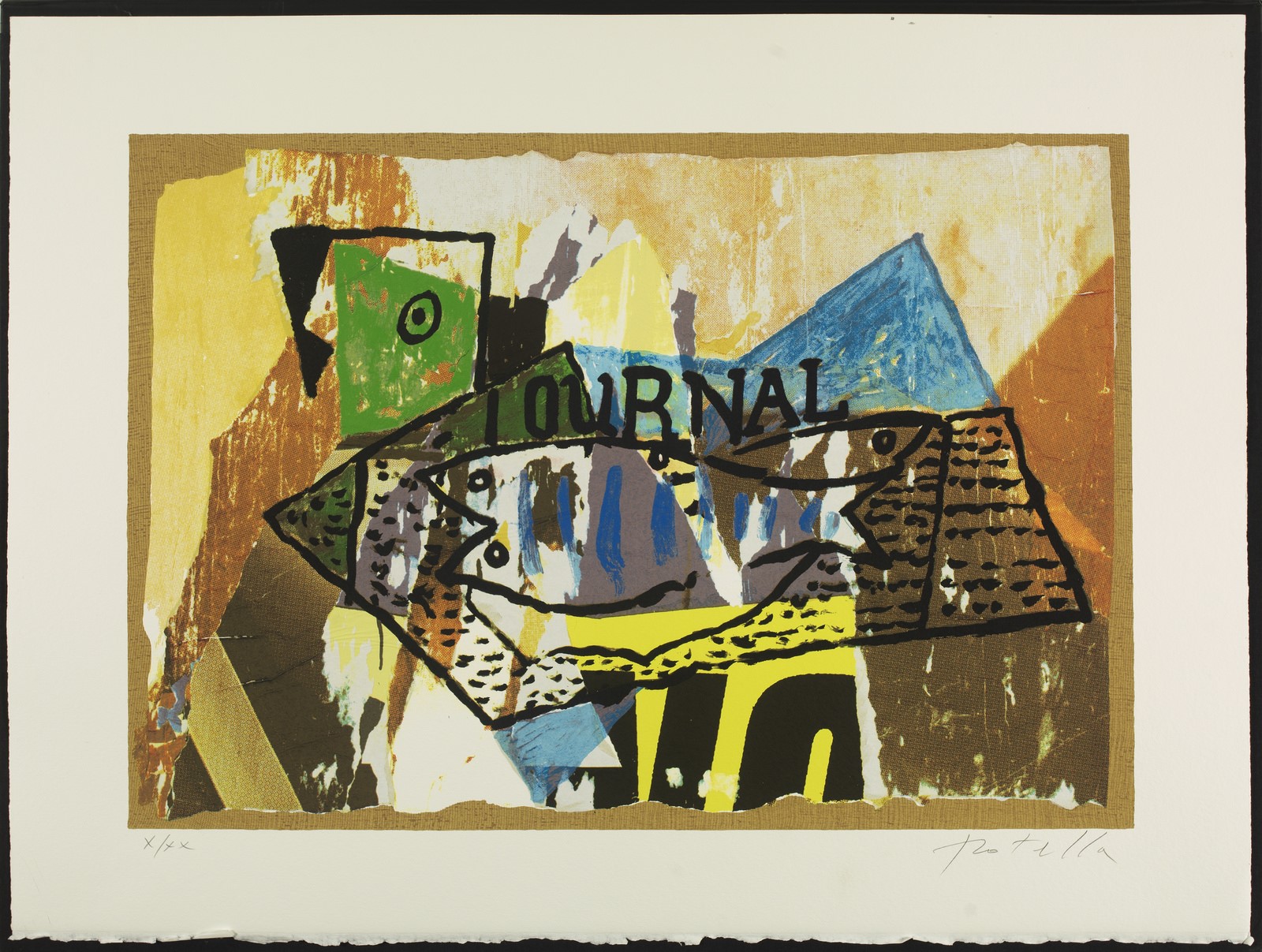 ROTELLA MIMMO (1918 - 2006) Senza titolo. Serigrafia. Cm 80,00 x 60,00. X/XX. Tiratura e firma a matita in basso. Filigrana Moulin du Gué in basso a destra. Stampatore: Alberto Serighelli, Arte3, Milano