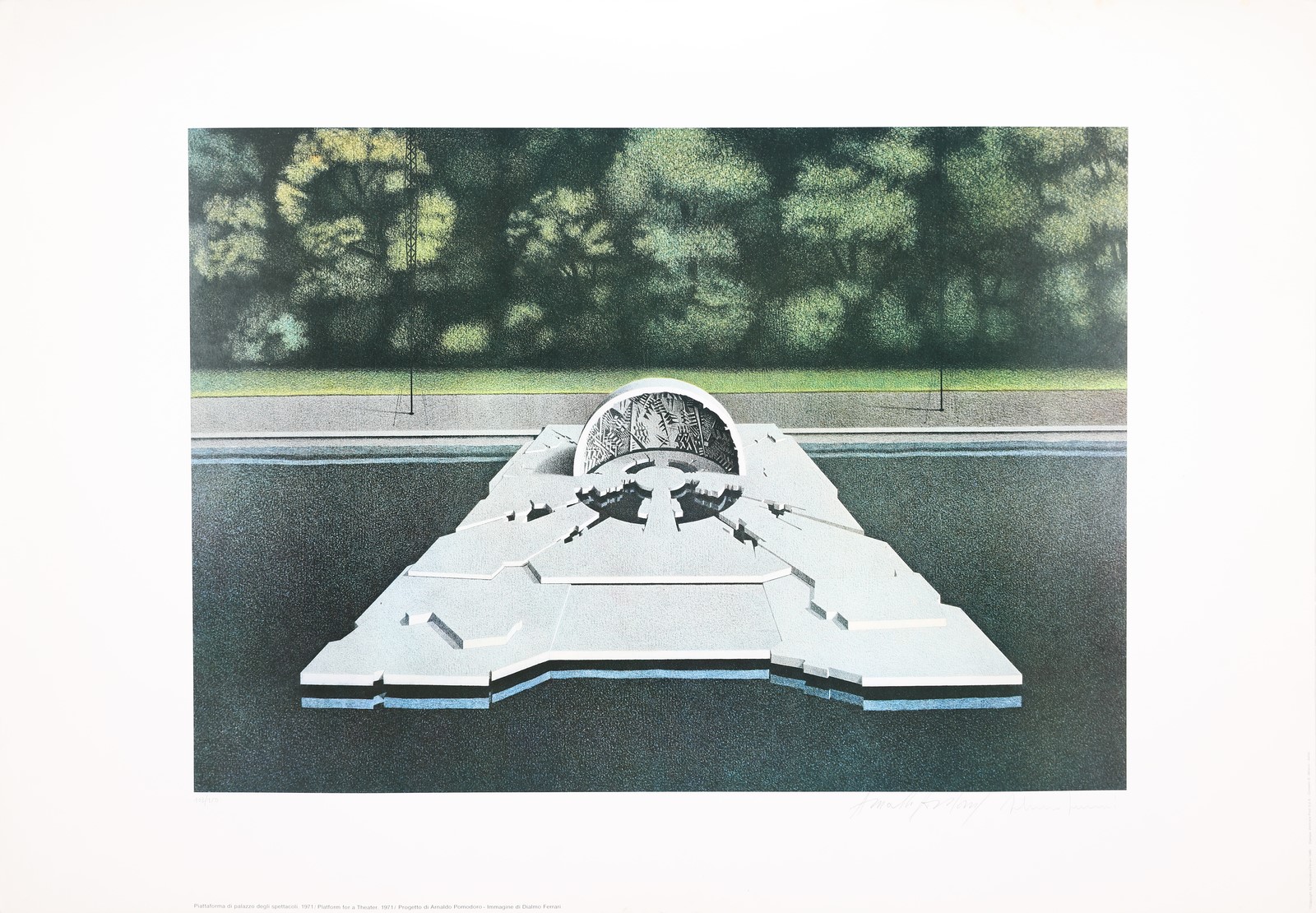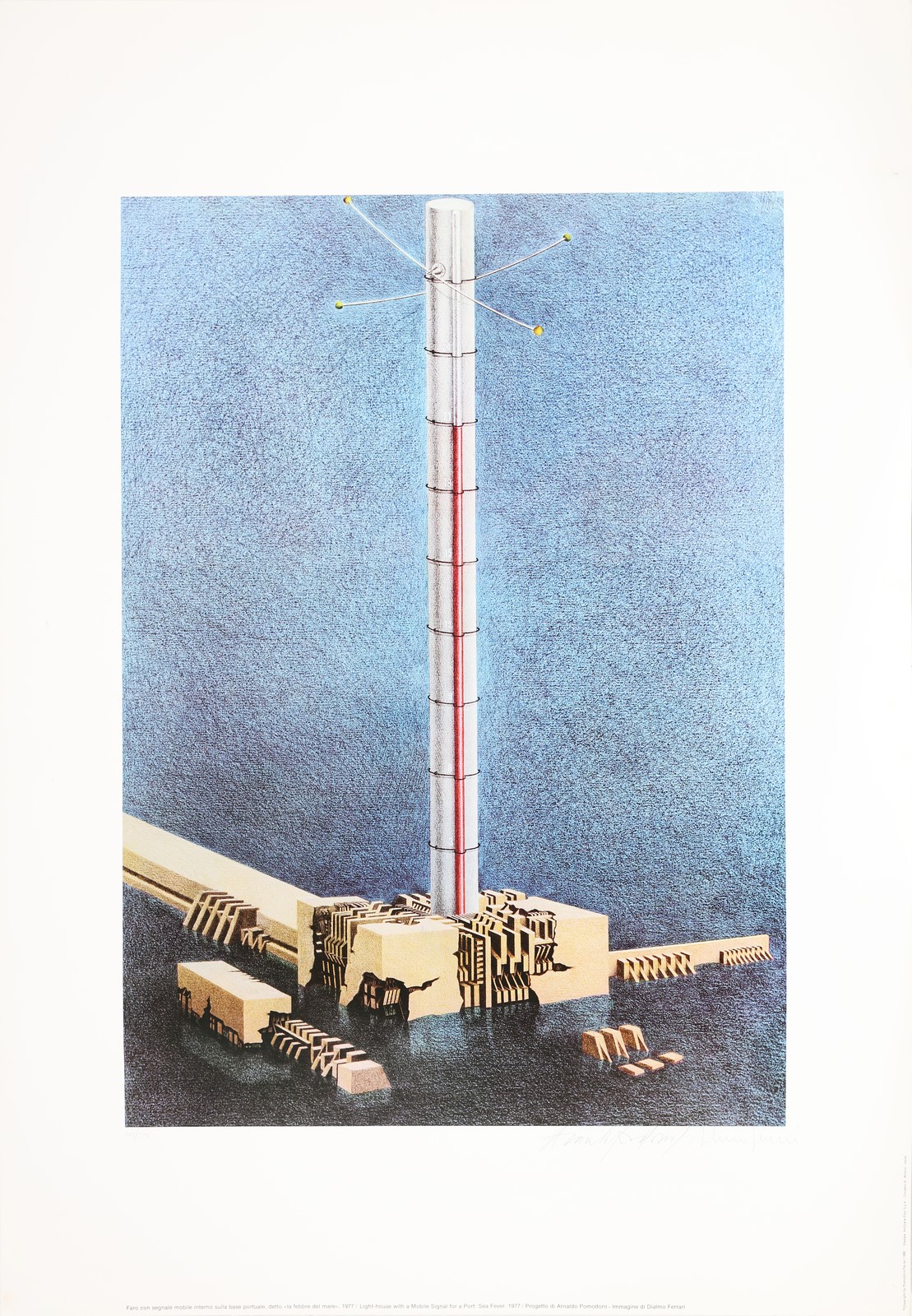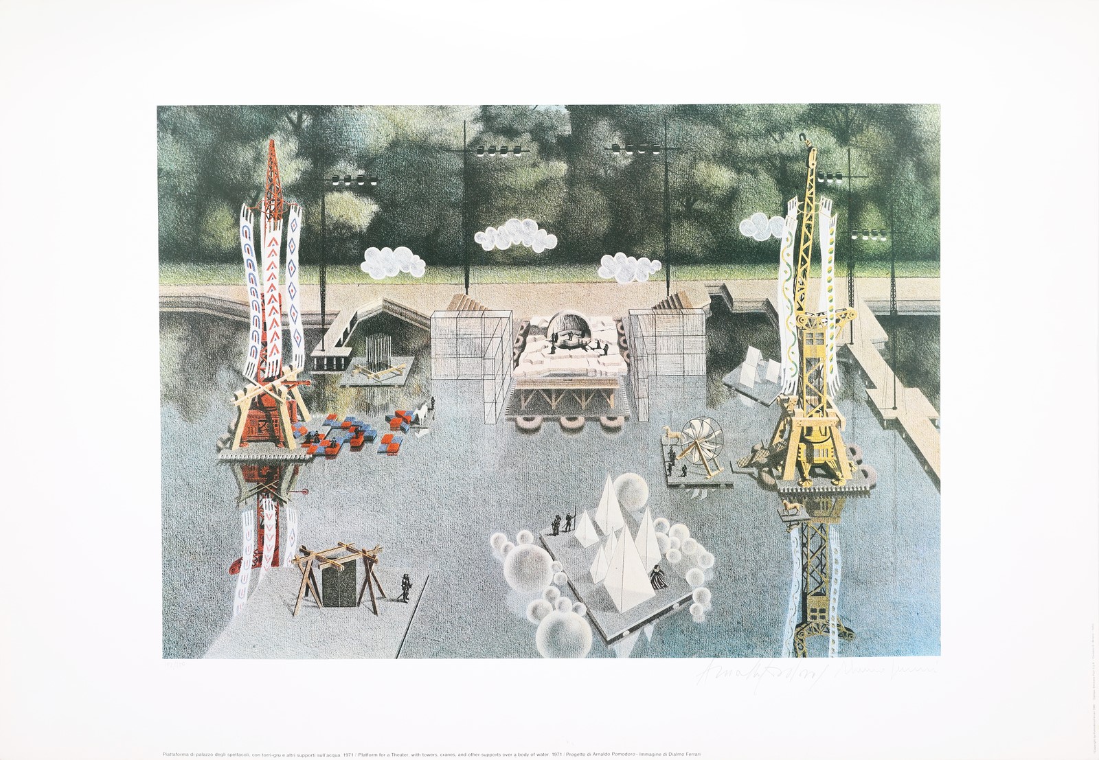 FERRARI DI ALMO & POMODORO ARNALDO Lotto composto da n.7 fogli. Litografia. Cm 70,00 x 50,00. Piattaforma di palazzo degli spettacoli 1971, muro imbottito di segni elementari 1979, piattaforma di palazzo degli spettacoli 1971,porta d'europa portale diplomatico con bande apribili sopra binario circolare 1978/1979, piattaforma di palazzo degli spettacoli con torri gru e altri supporti sull'acqua 1971, faro con segnale mobile interno sulla base portuale detto la febbre del mare 1976 . numerati a matita in basso a sinistra, firmati a matita in basso a destra