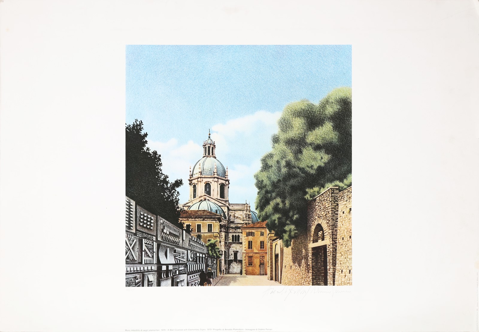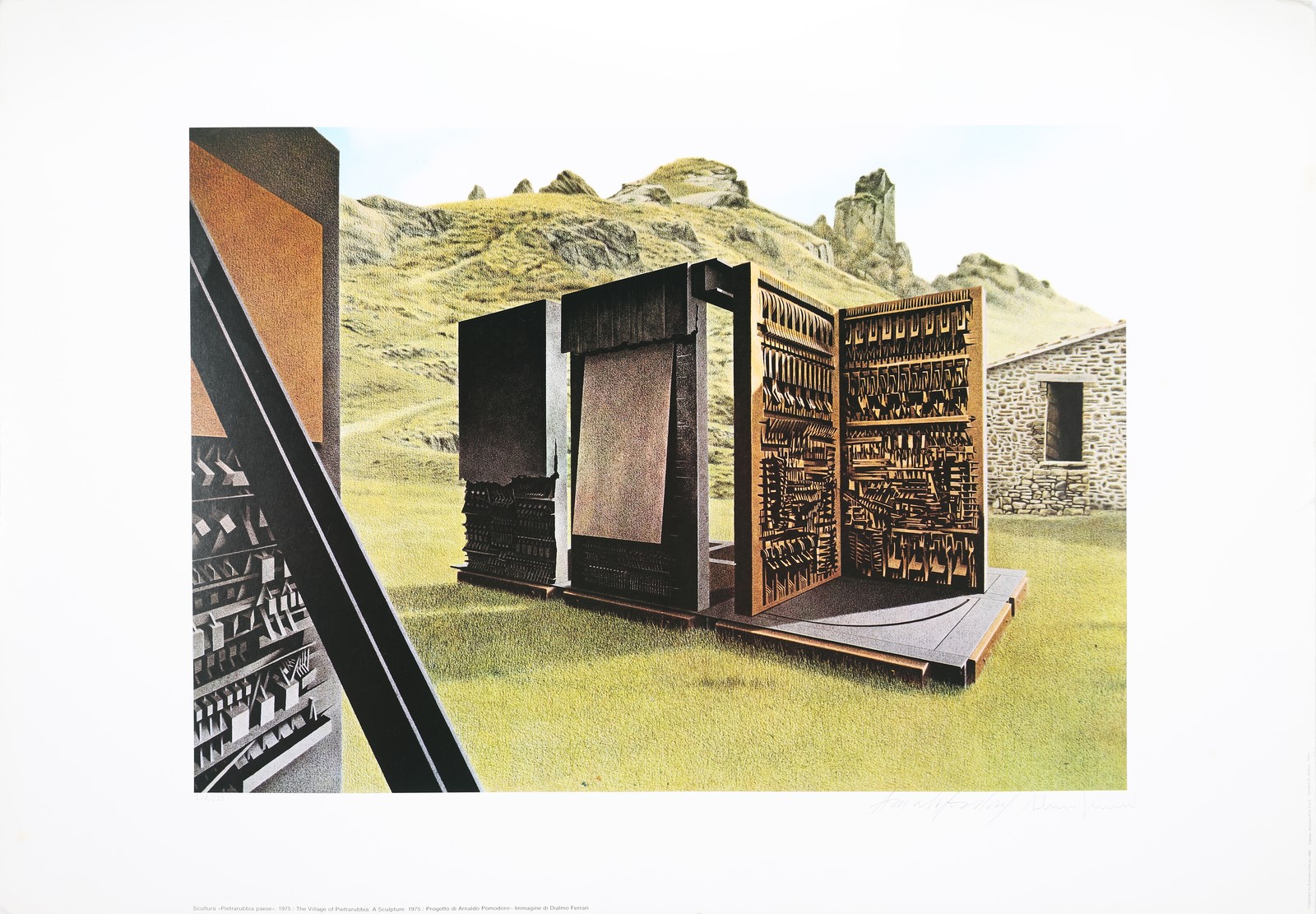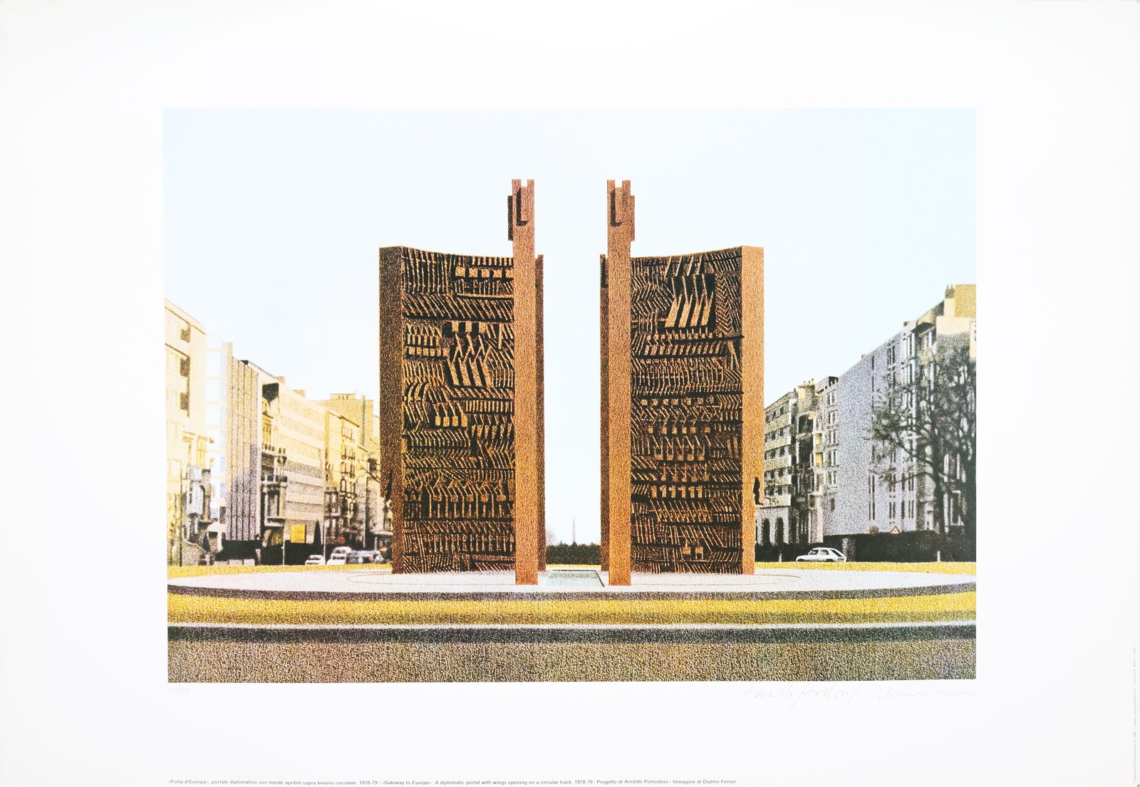 FERRARI DI ALMO & POMODORO ARNALDO Lotto composto da n.7 fogli. Litografia. Cm 70,00 x 50,00. Piattaforma di palazzo degli spettacoli 1971, muro imbottito di segni elementari 1979, piattaforma di palazzo degli spettacoli 1971,porta d'europa portale diplomatico con bande apribili sopra binario circolare 1978/1979, piattaforma di palazzo degli spettacoli con torri gru e altri supporti sull'acqua 1971, faro con segnale mobile interno sulla base portuale detto la febbre del mare 1976 . numerati a matita in basso a sinistra, firmati a matita in basso a destra