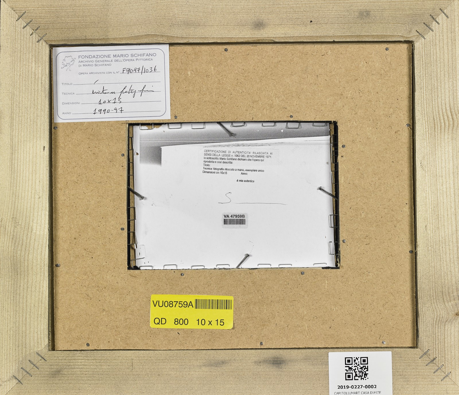 SCHIFANO MARIO (1934 - 1998) Senza titolo. Fotografia ritoccata a mano. Cm 15,00 x 10,00. Timbro a secco Schifano in basso a sinistra. Al retro firma e cartiglio descrittivo Fondazione Multistudio Mario Schifano. Opera archiviata presso la Fondazione Mario Schifano Multistudio in data 30 Ottobre 2007, come da documentazione fotografica allegata all'opera riportante il relativo numero d'inventario. Certificato di autenticità Telemarket, Roncadelle (Bs). 1990-1997. Cornice presente
