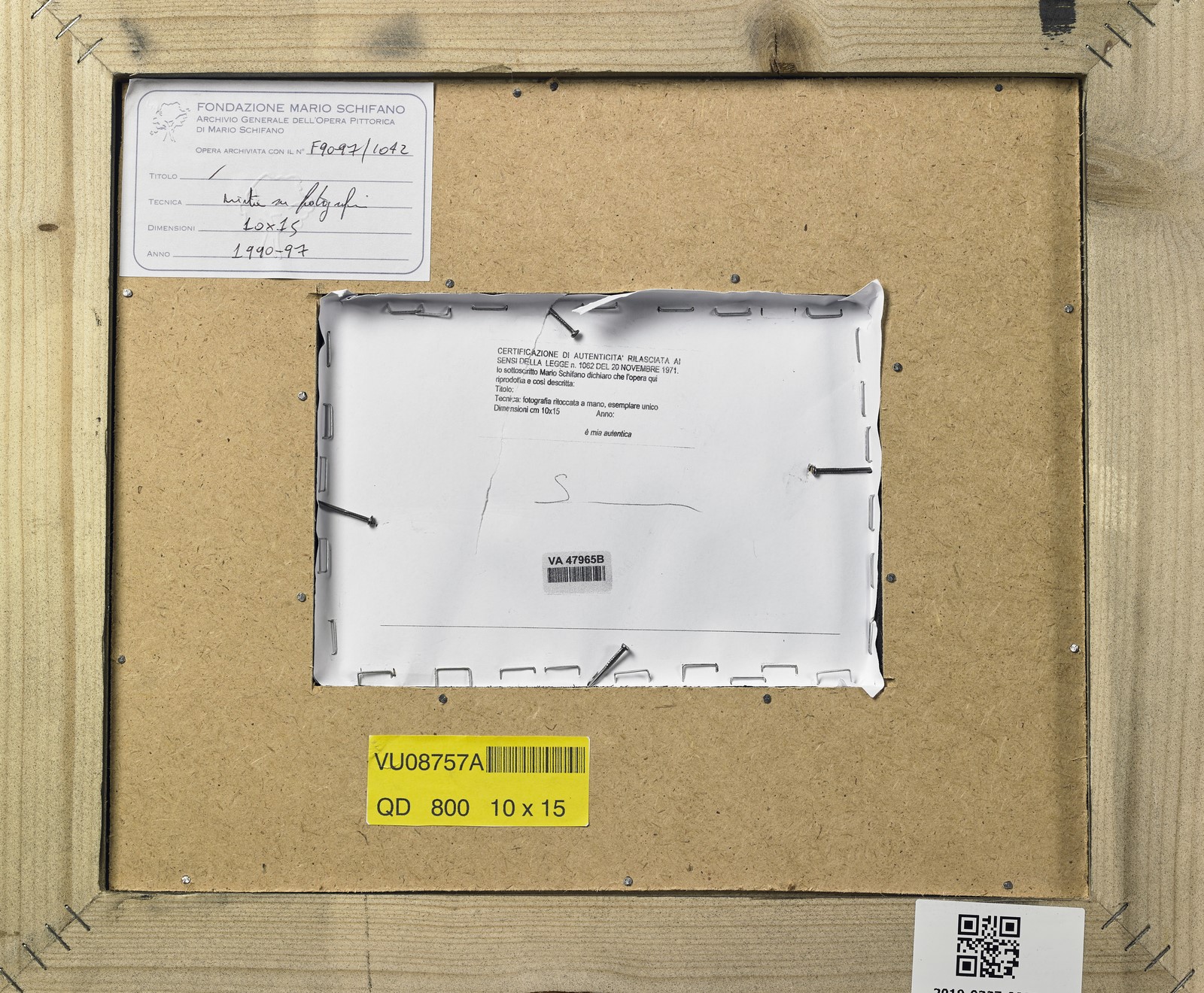 SCHIFANO MARIO (1934 - 1998) Senza titolo. Fotografia ritoccata a mano. Cm 15,00 x 10,00. Timbro a secco Schifano in basso a sinistra. Al retro firma e cartiglio descrittivo Fondazione Multistudio Mario Schifano. Opera archiviata presso la Fondazione Mario Schifano Multistudio in data 30 Ottobre 2007, come da documentazione fotografica allegata all'opera riportante il relativo numero d'inventario. Certificato di autenticità Telemarket, Roncadelle (Bs). 1990-1997. Cornice presente