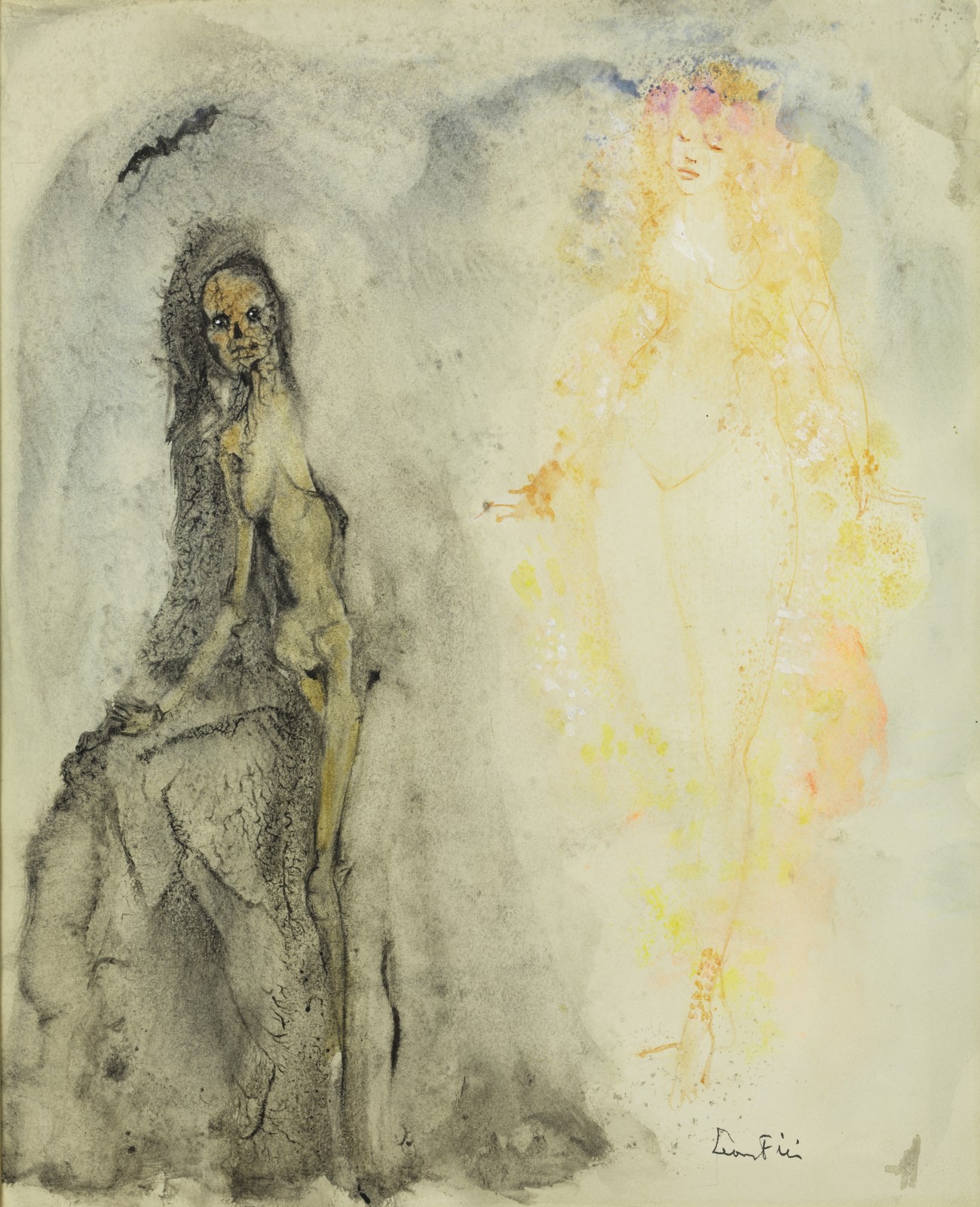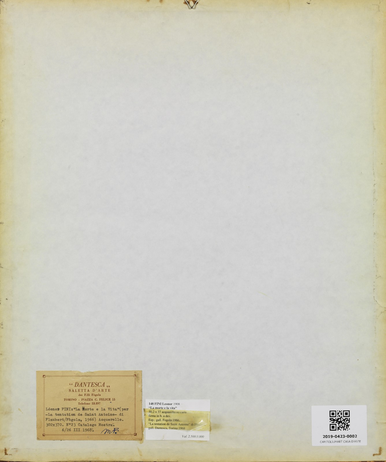 FINI LEONOR (1908 - 1996) La morte e la vita. . Acquarello su carta. Cm 30,20 x 37,00. Firma in basso a destra. Al retro cartiglio descrittivo Saletta d'Arte Dantesca, Torino. Esposizione: Galleria Fogola, 1966. Galleria Dantesca, Torino 1968. Provenienza: Galleria Dantesca, Torino. Cornice presente