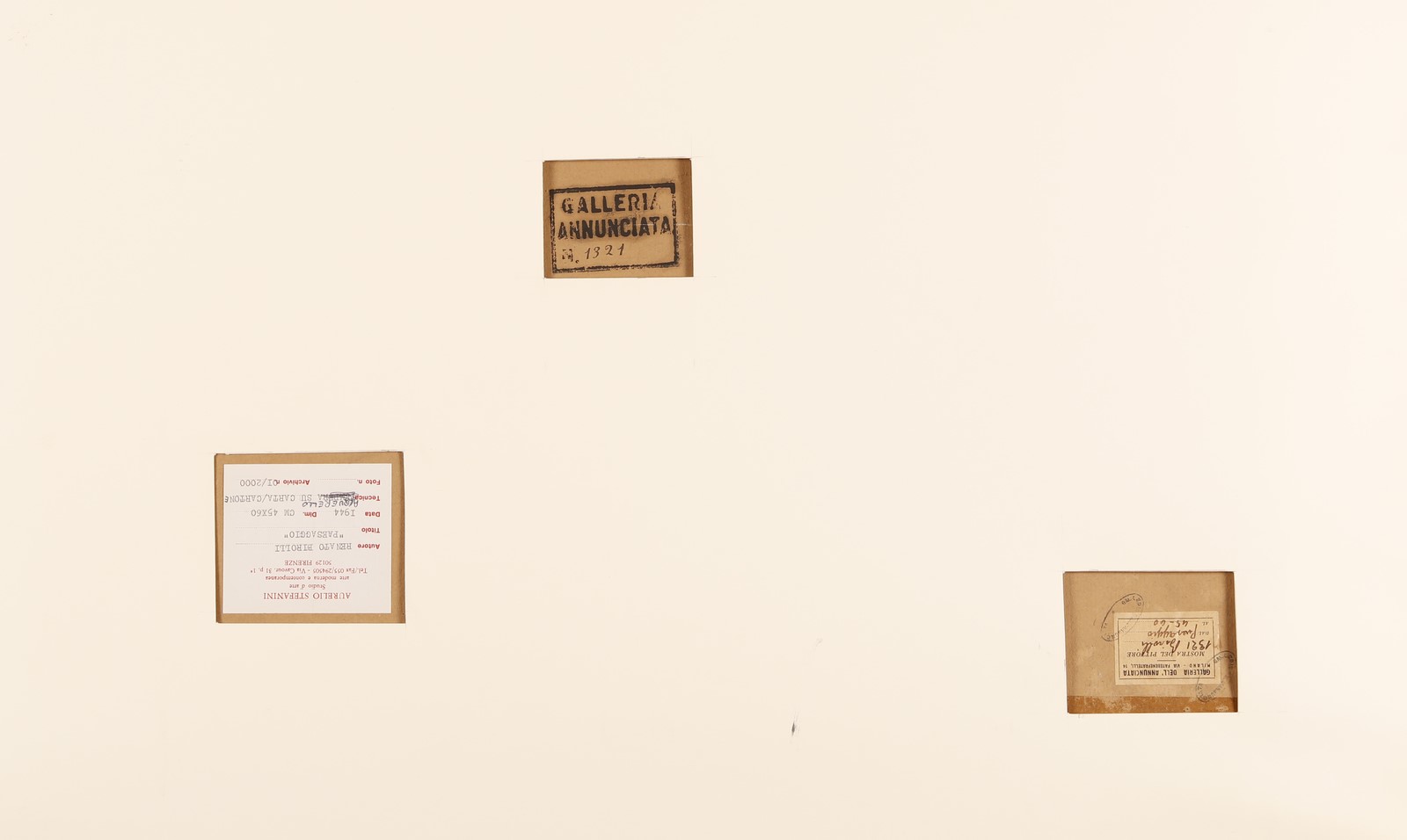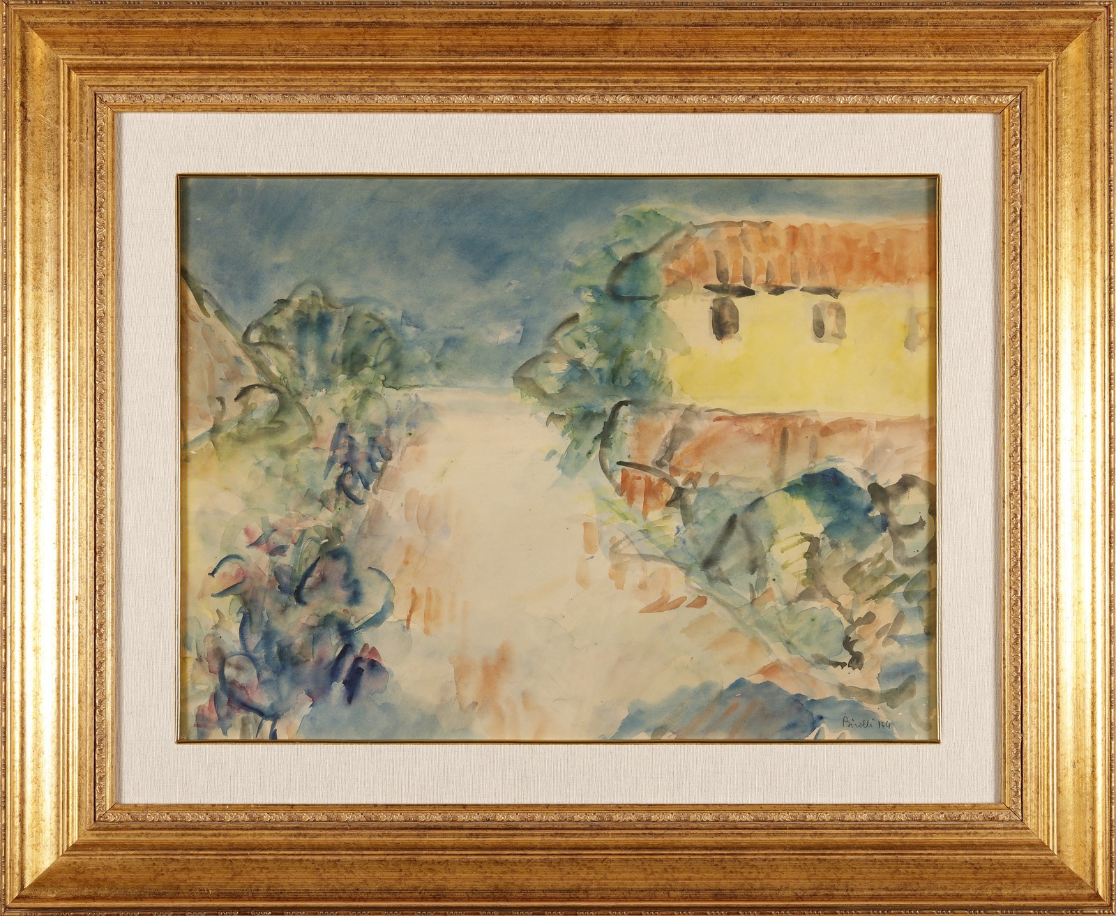 BIROLLI RENATO (1905 - 1959) Paesaggio. 1944. Tecnica mista su carta. Cm 60,00 x 45,00. Firma e anno in basso a destra. Al retro cartiglio descrittivo e timbro Galleria dell'Annunciata, Milano e cartiglio descrittivo Studio D'Arte Aurelio Stefanini. Cornice presente