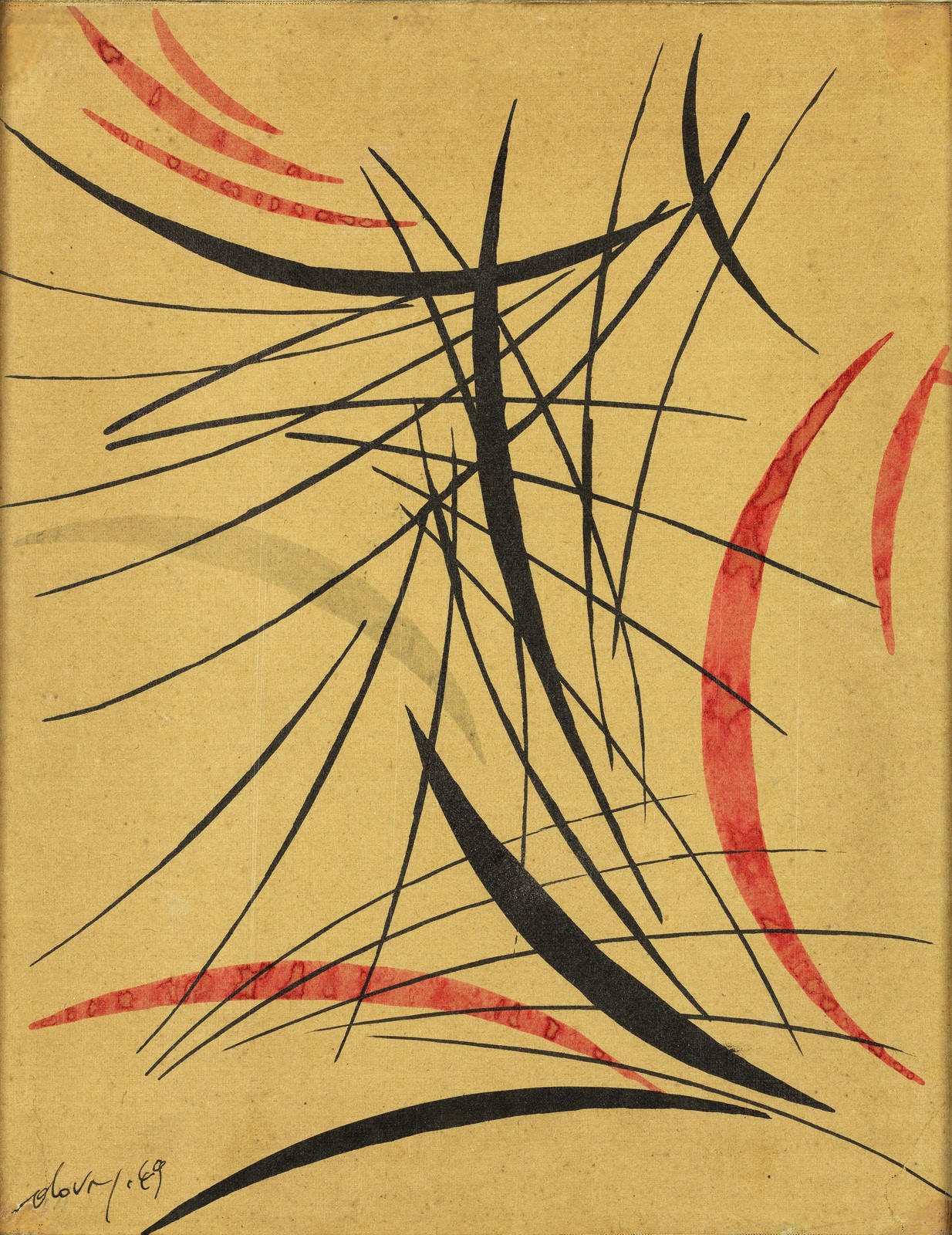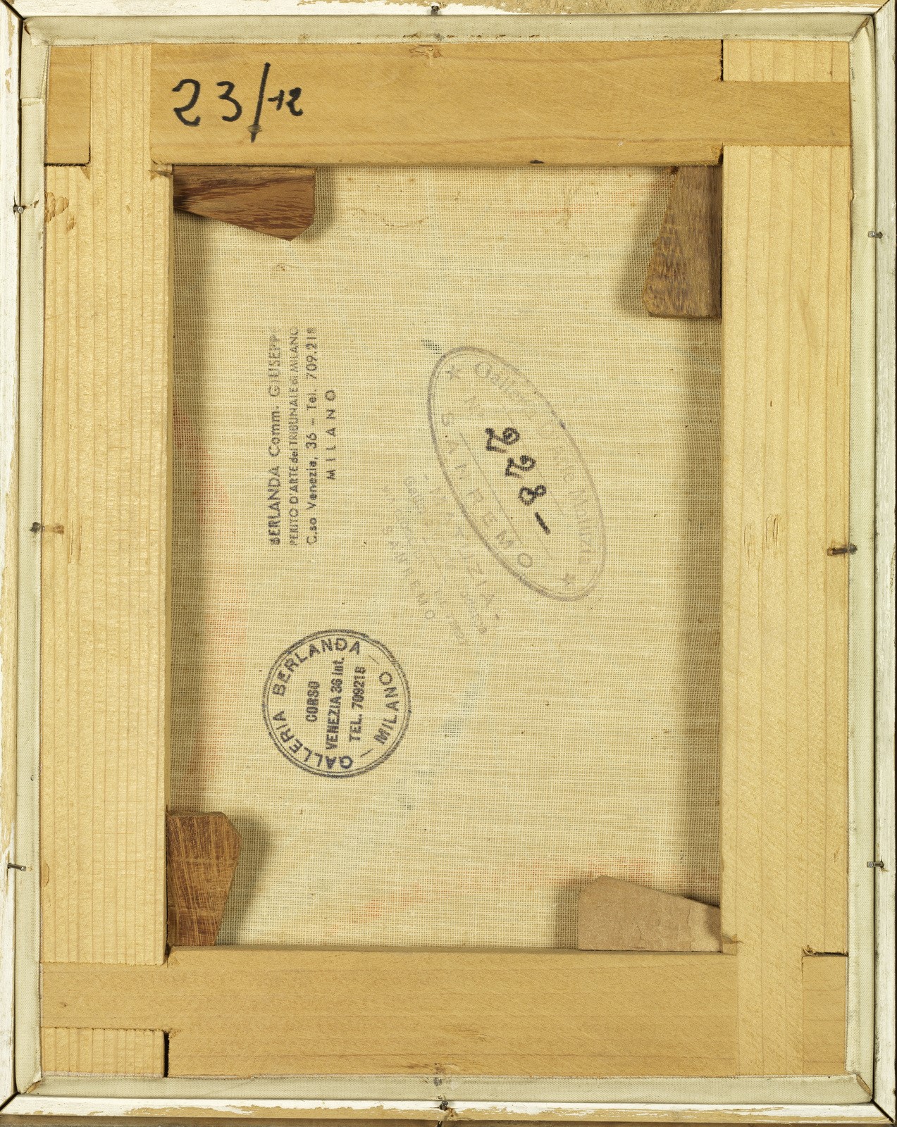 DOVA GIANNI (1925 - 1991) Senza titolo. 1949. Tecnica mista su carta intelata. Cm 22,00 x 28,00. Firma e anno in basso a sinistra. Al retro timbro Galleria d'Arte, Sanremo e timbro Galleria Berlanda, Milano. Presenti lievi difetti. Cornice presente