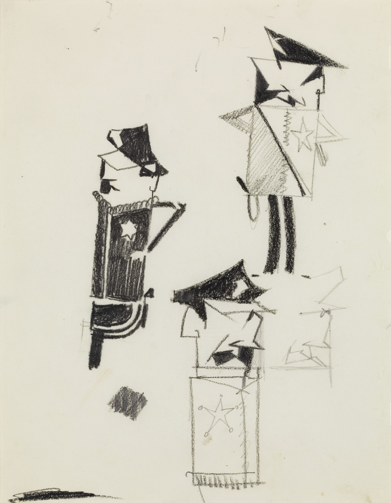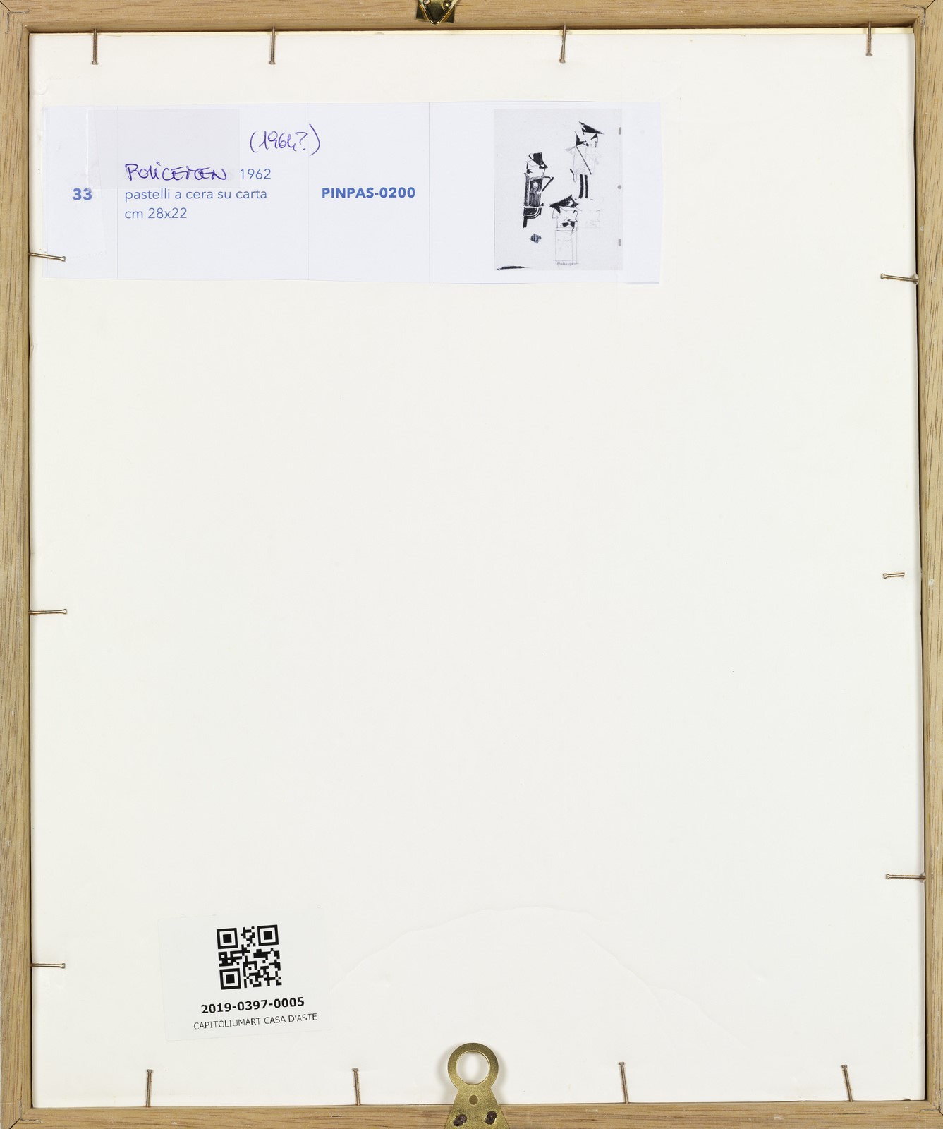PASCALI PINO (1935 - 1968) Policeman. 1962. Tecnica mista su carta. Cm 22,00 x 28,00. Pubblicazione: Pino Pascali - Insorgenza dell'immaginifico a cura di Massimo Bignardi e Nuccia Barbone Pugliese, Claudio Grenzi Editore, Galleria Nazionale della Puglia, Palazzo Sylos - Calò, 21 Dicembre 2018 - 21 Marzo 2019, 48. Cornice presente