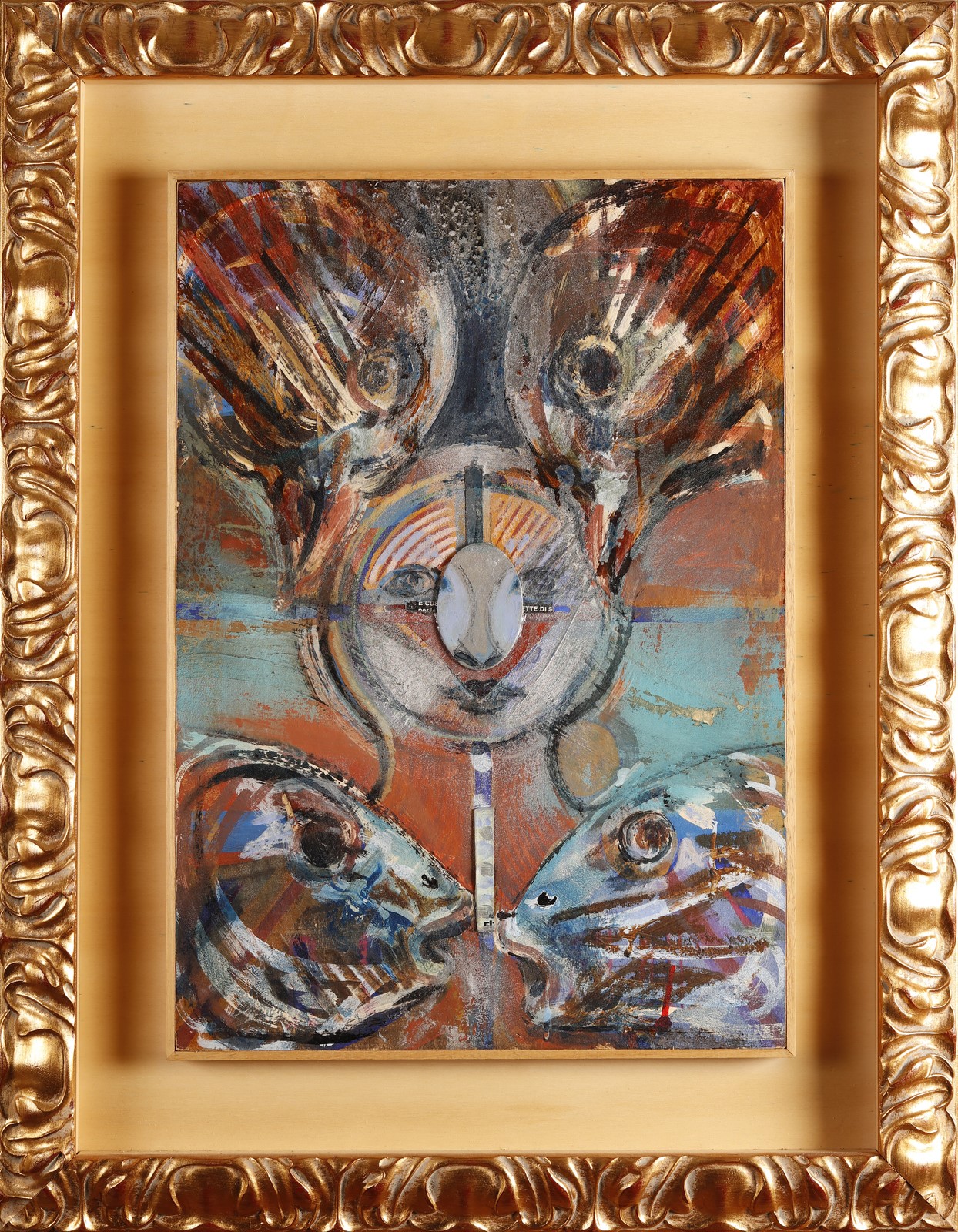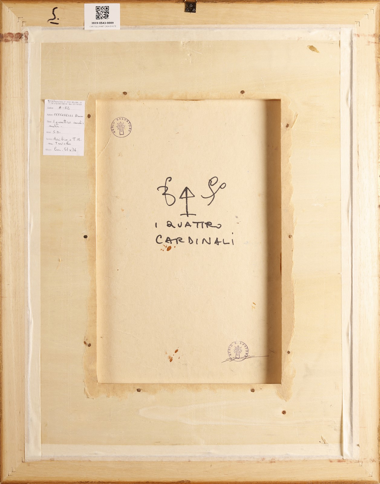CECCOBELLI BRUNO (n. 1952) I quattro cardinali. Tecnica mista su cartone pressato. Cm 36,00 x 51,00. Al retro titolo, firma e cartiglio descrittivo. Autentica dell'artista su fotografia. Presenti lievi difetti. Cornice presente