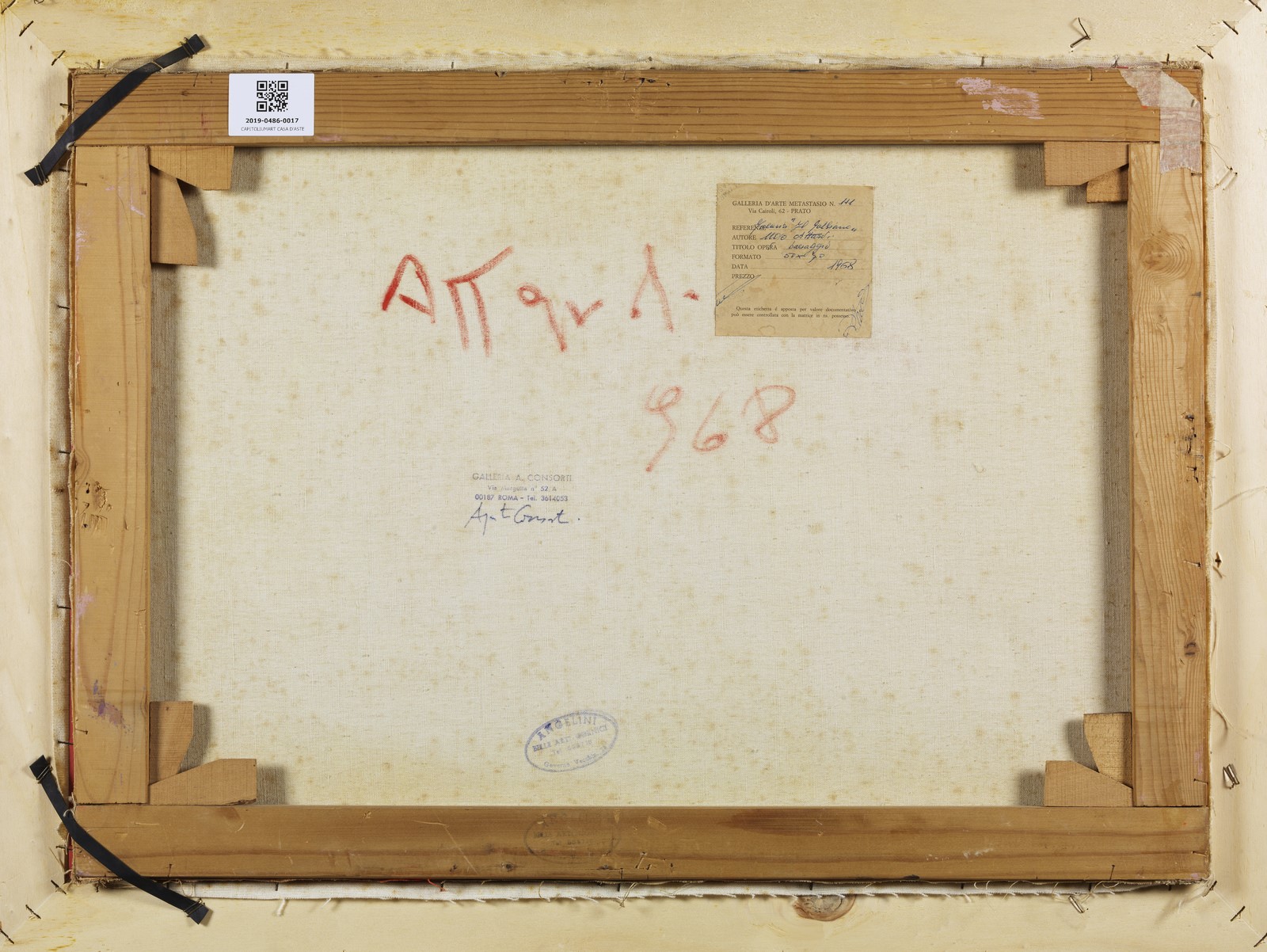 ATTARDI UGO (1923 - 2006) Senza titolo. 1968. Olio su tela . Cm 70,00 x 50,00. Firma in basso a destra. Al retro firma, anno, timbro della Galleria Consorti, Roma, timbro della Galleria Angelini e cartiglio descrittivo Galleria Metastasio, Prato.Opera archiviata presso l'Archivio delle opere di Ugo Attardi come da documentazione fotografica allegata all'opera riportante il relativo numero d'inventario e la firma dell'artista.