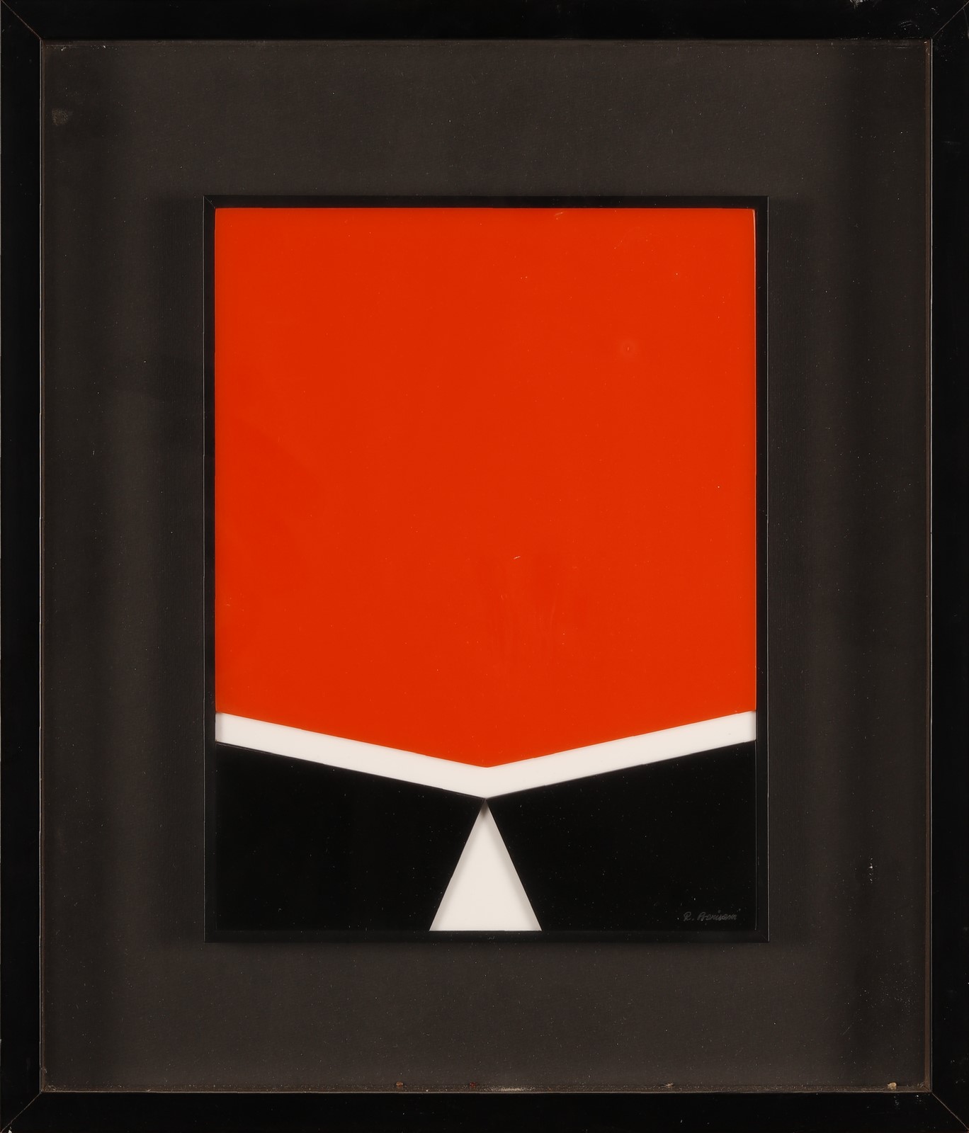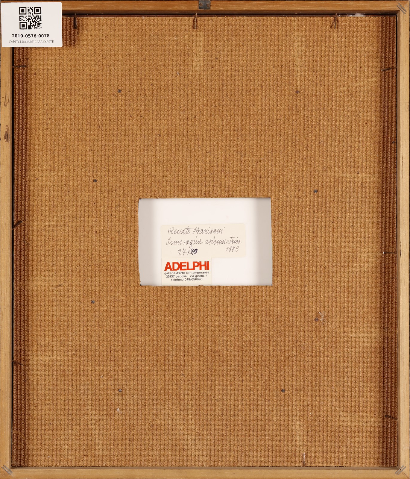 BARISANI RENATO (1918 - 2011) Immagine asimmetrica. 1973. Tecnica mista su tavola. Cm 20,00 x 27,00. Firma in basso a destra. Al retro titolo, firma, anno e cartiglio Galleria d'Arte Adelphi, Padova,. Cornice presente