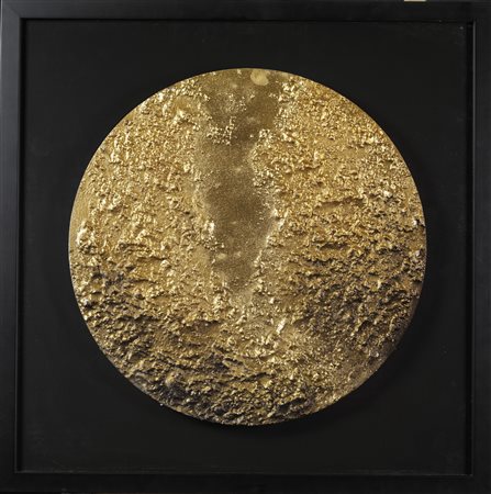 ROMANO PAOLA (n. 1951) Luna d'oro. 2018. Tecnica mista su tavola. Cm 50,00 x 50,00. Titolo, firma e anno al retro.Autentica dell'artista su fotografia come da documentazione fotografica allegata all'opera riportante il relativo numero d'inventario. Lievi difetti. Cornice presente
