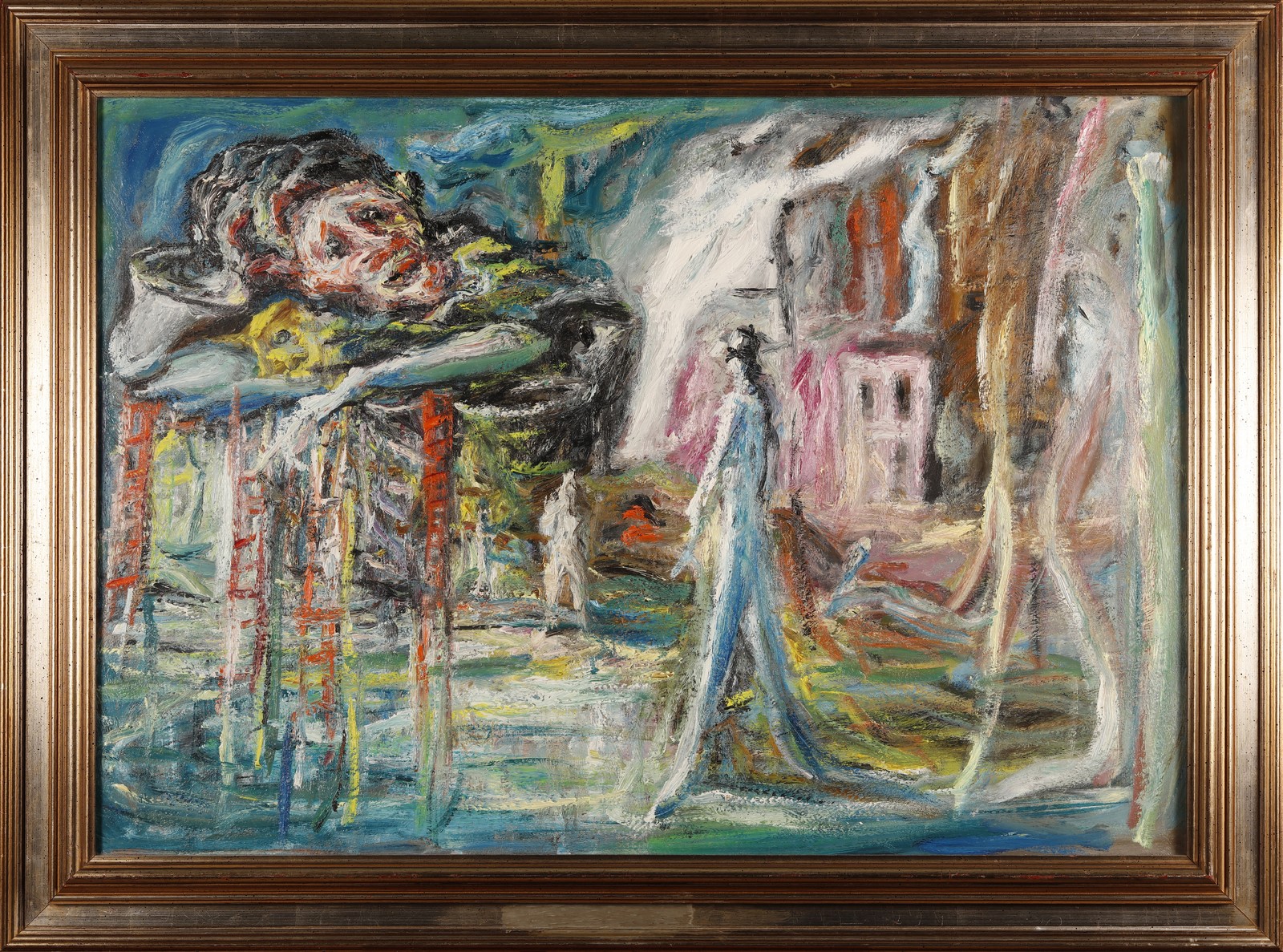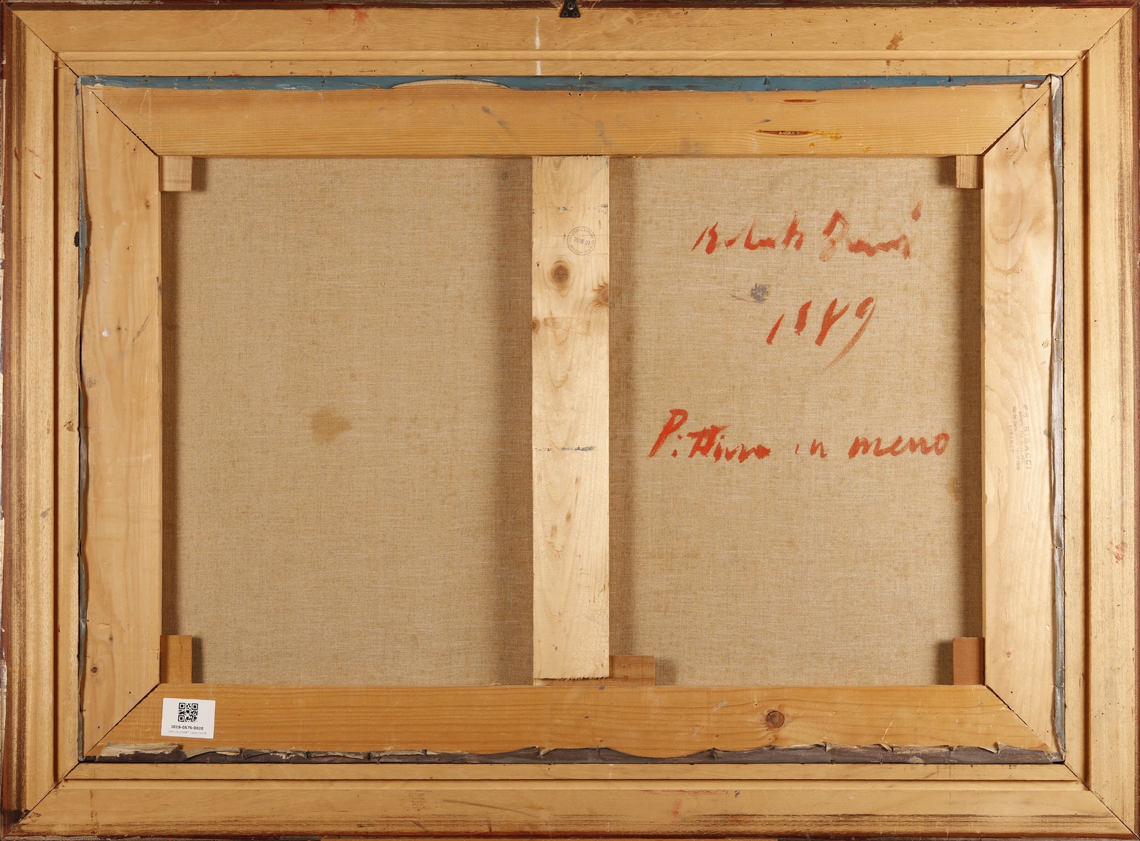 BARNI ROBERTO (n. 1939) Giù la maschera. 1988. Olio su tela . Cm 100,00 x 70,00. Al retro firma, anno e timbro Galleria Le Muse. Autentica dell'artista su fotografia. Provenienza: Finarte, Roma. Aurelio Stefanini Studio d'arte, Firenze. Pubblicazione: Catalogo d'asta n.734, Finarte, Roma, 10 Aprile 1990, lotto 106, p.26-27. Cornice presente