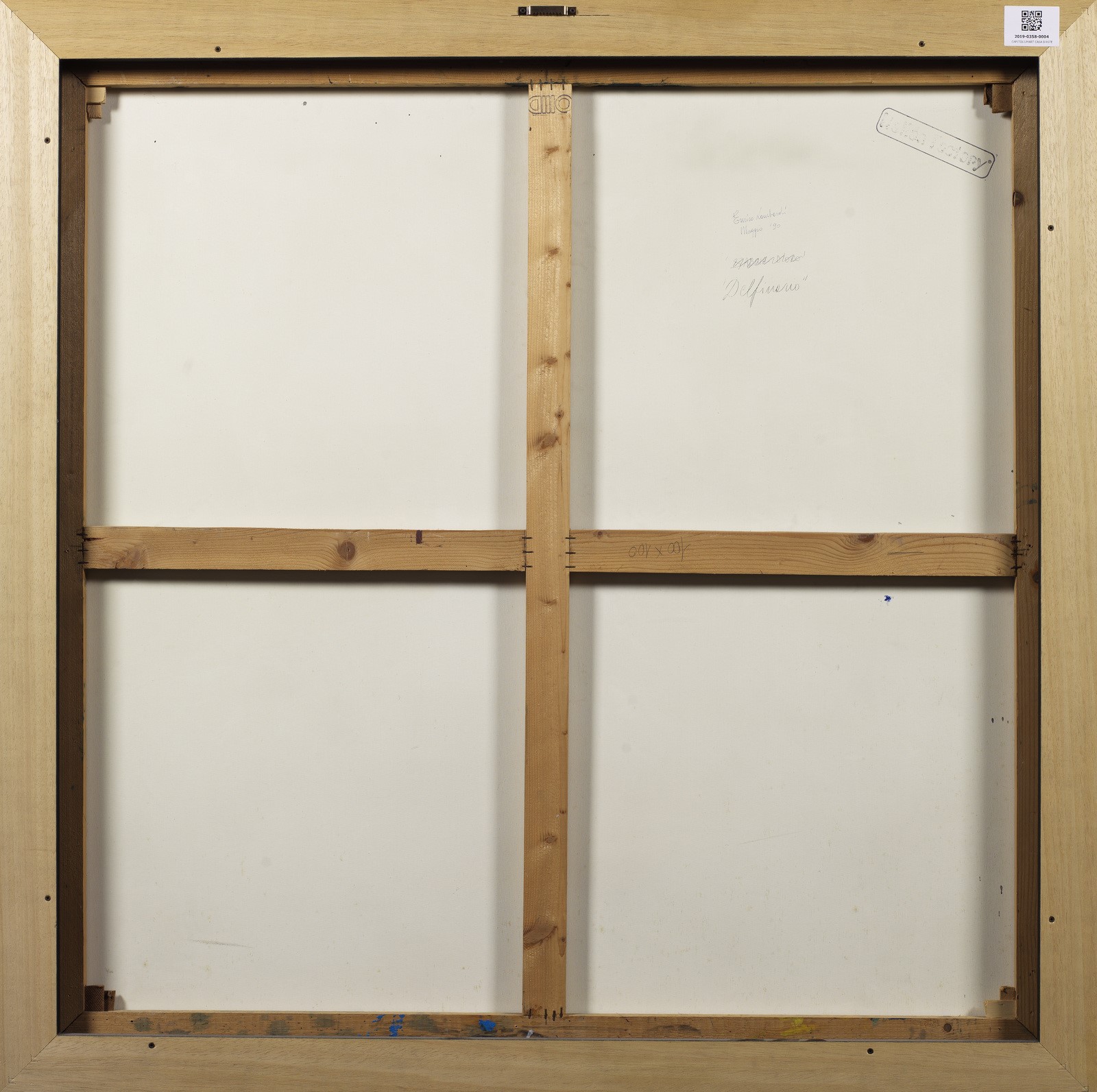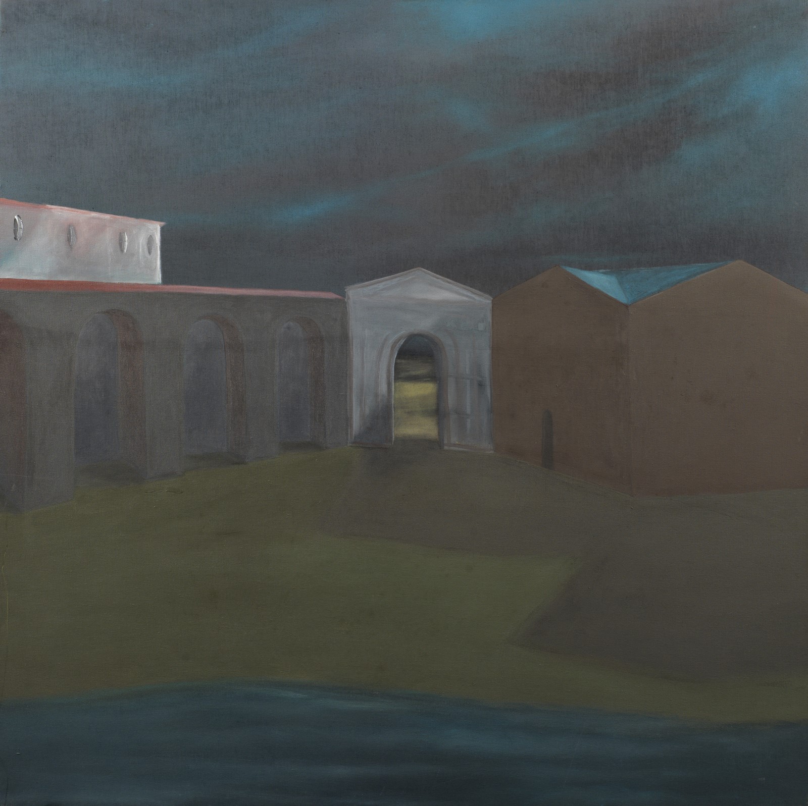 LOMBARDI ENRICO (n. 1958) Delfinario. 1990. Olio su tela . Cm 100,00 x 100,00. Al retro titolo, firma e anno.Autentica dell'artista su fotografia con timbro Italian Factory. Cornice presente