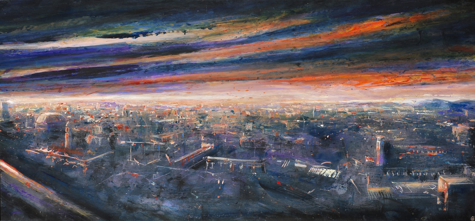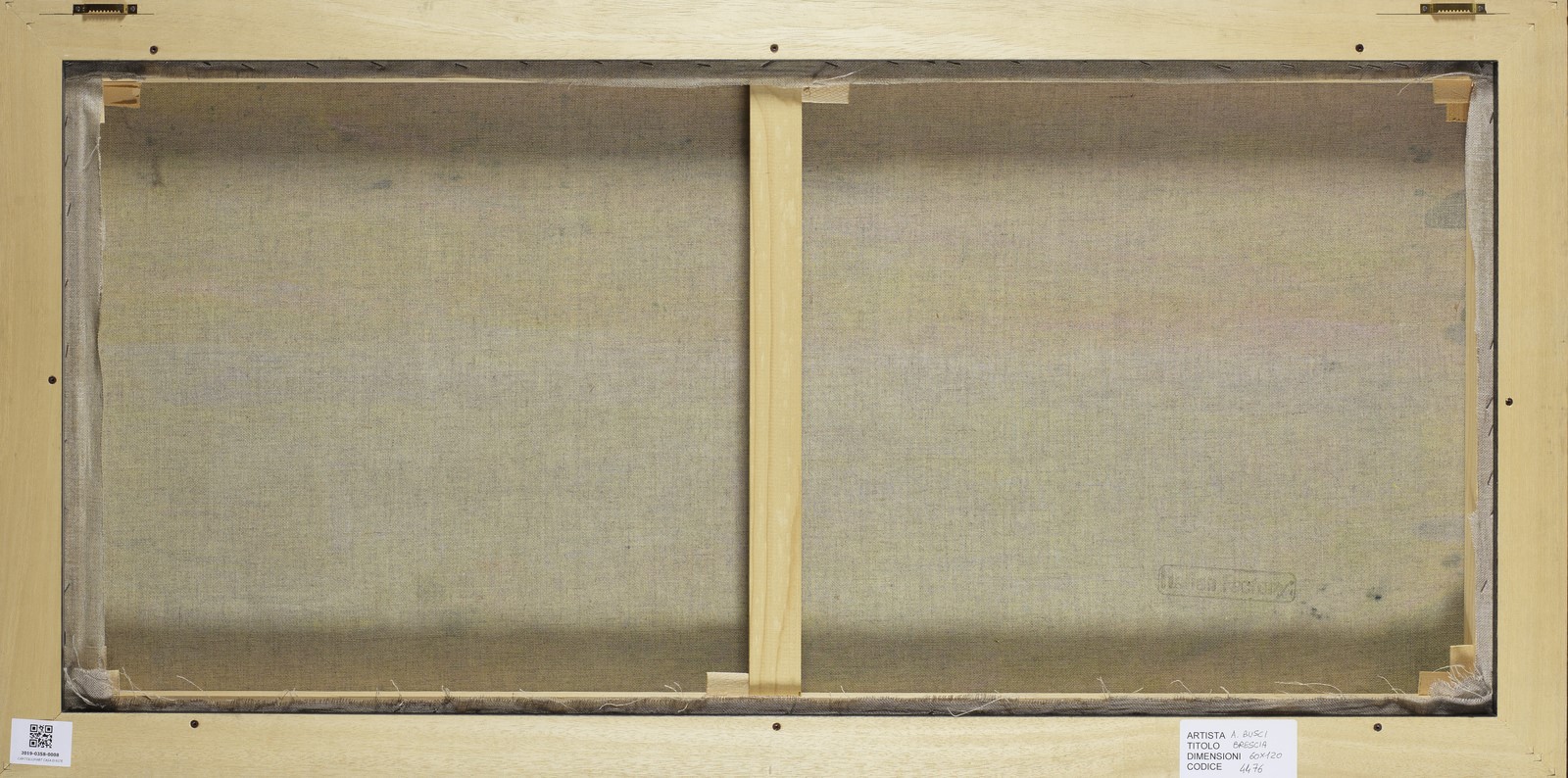 BUSCI ALESSANDRO (n. 1971) Brescia. Olio su carta su tela. Cm 120,00 x 60,00. Firma in basso a destra. Al retro timbro Italian Factory.Autentica dell'artista su fotografia con timbro Italian Factory. Lievi difetti. Cornice presente