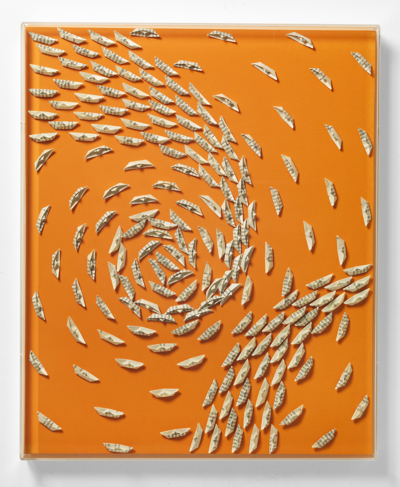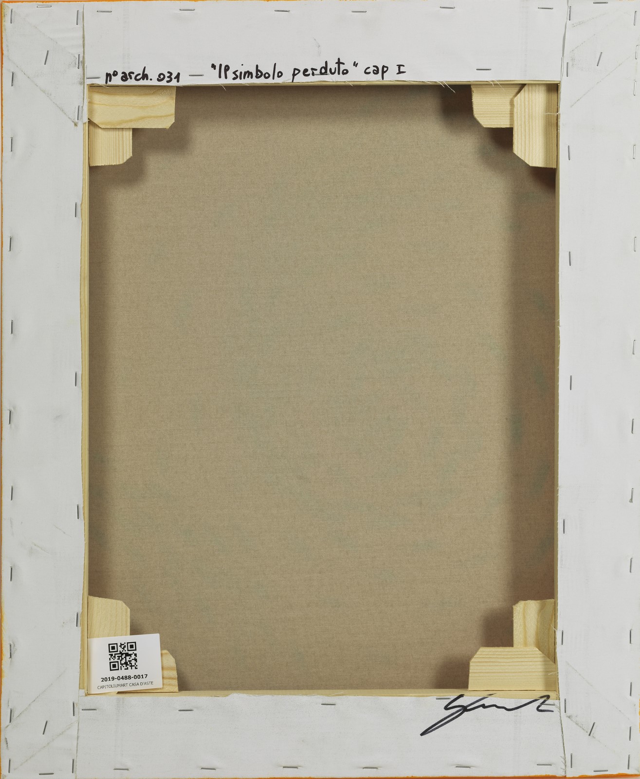 GUSMAROLI RICCARDO (n. 1963) Il simbolo perduto cap 1. 2019. Tecnica mista e applicazioni su tela. Cm 45,00 x 55,00. Al retro titolo e firma. Entro teca di plexiglass.Autentica dell'artista su fotografia. Cornice presente