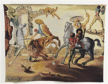 DALI' SALVADOR (1904 - 1989) Battle around a Dandelion. Arazzo. Cm 135,00 x 105,00. Firma a stampa in basso a sinistra. Edizione limitata di 600 esemplari numerati al retro.