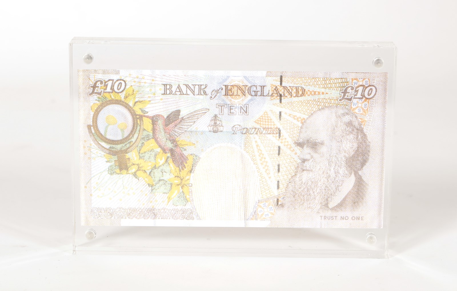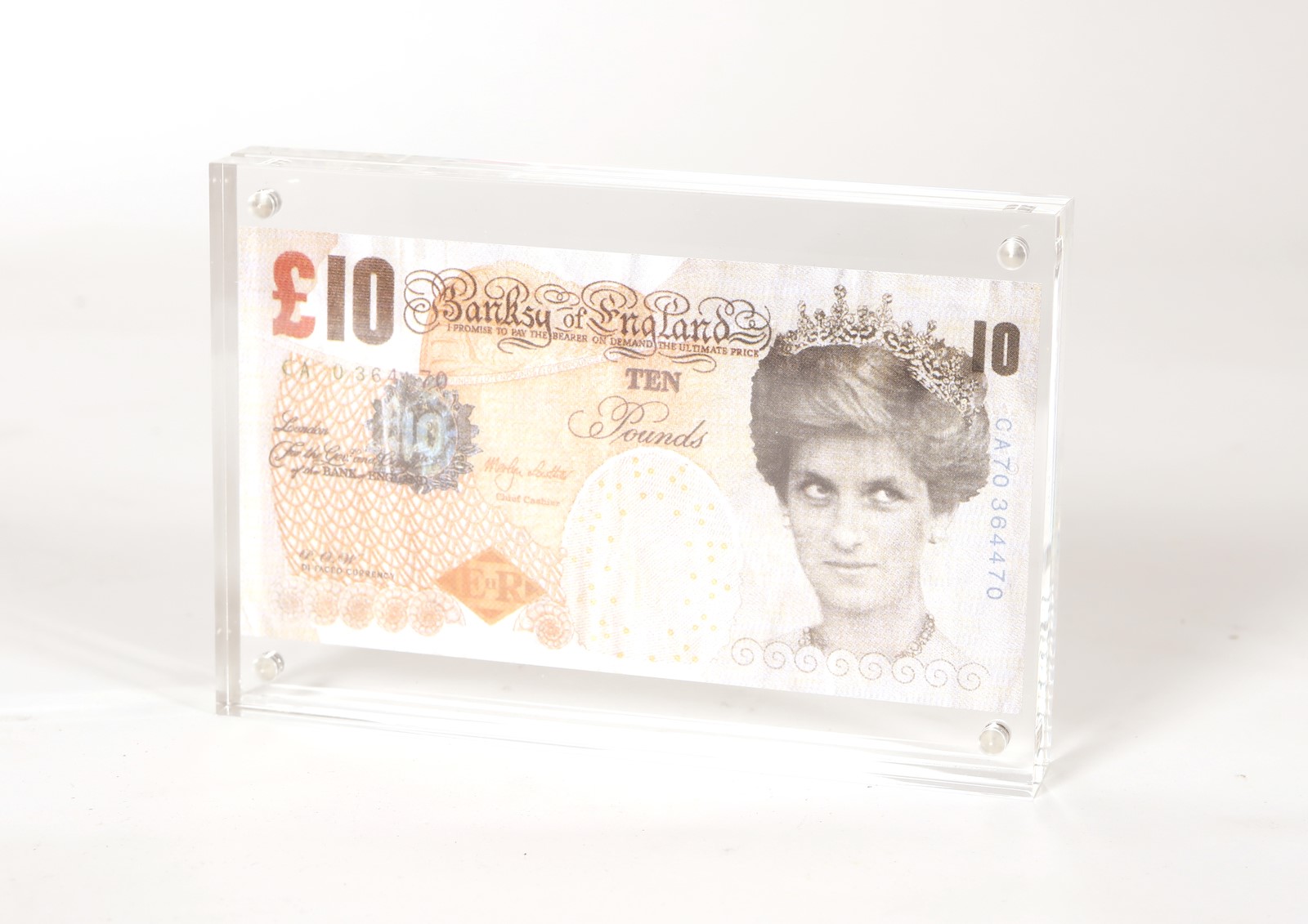 BANKSY (n. 1975) Di -Faced Tenner. Stampa Offset. Cm 15,00 x 7,50. . Cornice presente