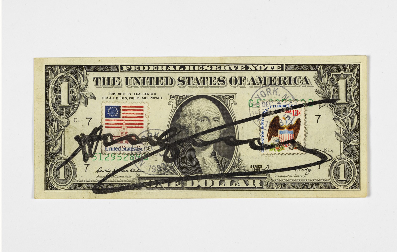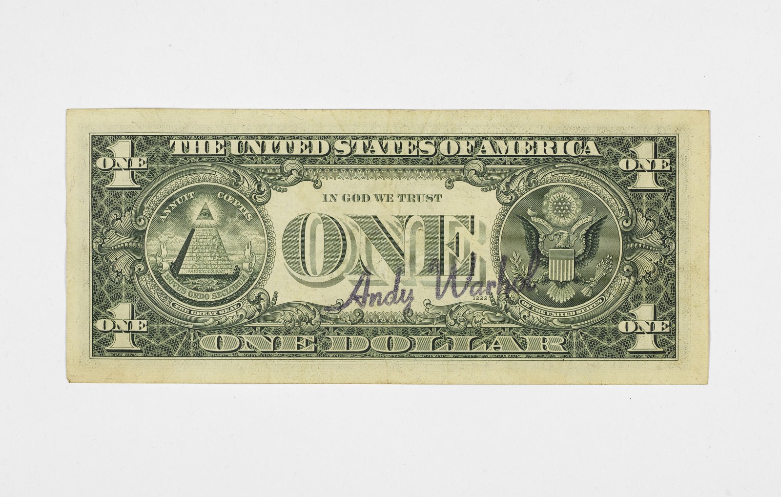 WARHOL ANDY (1928 - 1987) One dollar. Intervento su banconota. Cm 15,50 x 6,50. Firma a stampa e firma a pennarello.