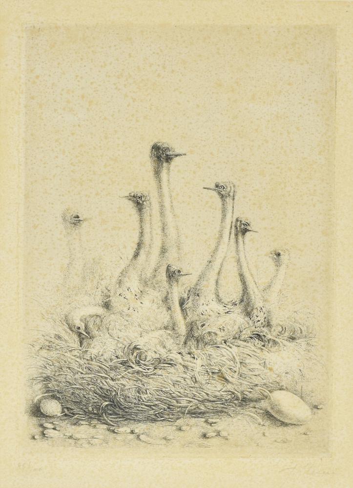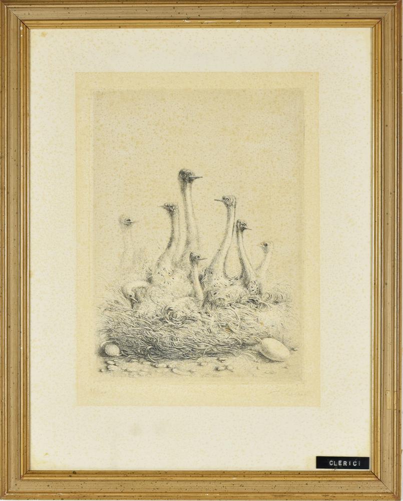 Clerici Fabrizio STRUZZI NEL NIDO incisione su carta, cm 47x36 (lastra cm...