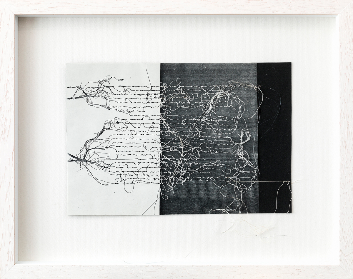 L'opera è una xerografia (per metà con fondo bianco e per metà con fondo nero) di scritture fatte con la macchina da cucire, unita dall'artista ad un cartoncino mediante cuciture di filo bianco e nero