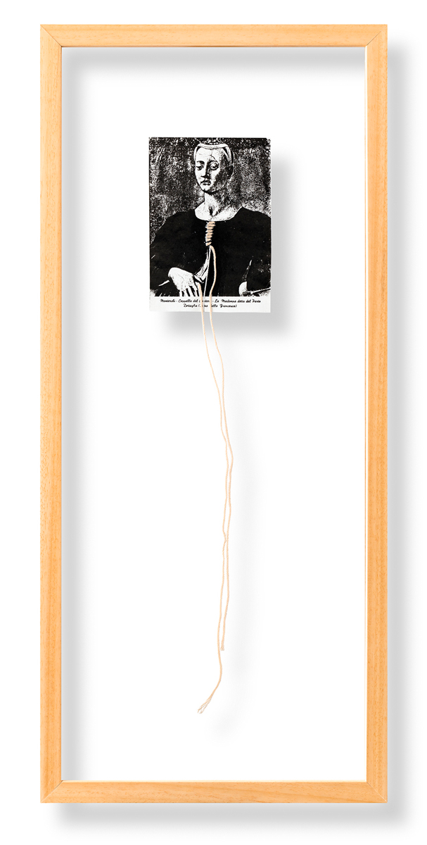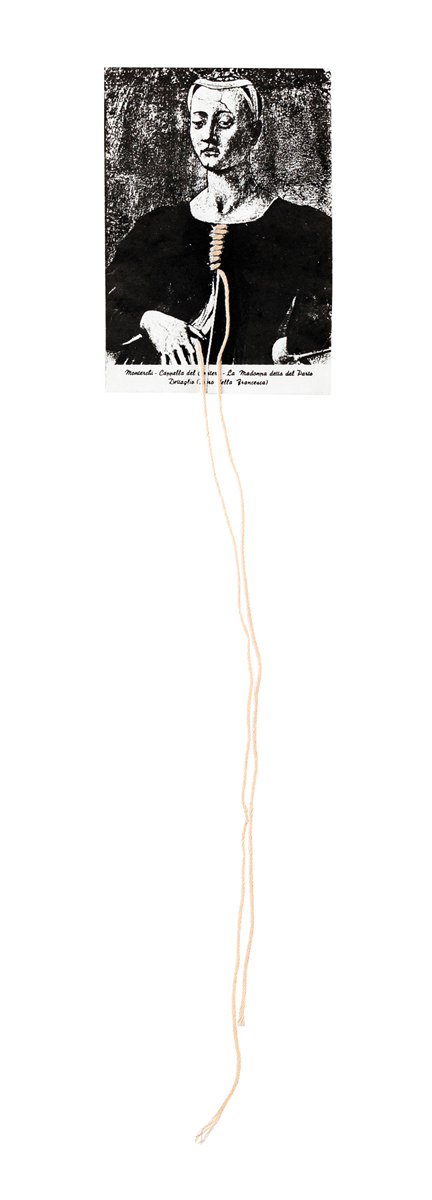 L'opera si compone di tre xerografie sovrapposte cucite con corda grezza lasciata fluire per circa 40 cm