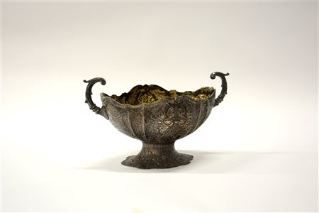 Centrotavola biansato in metallo argentato decorato in rilievo a scene con...
