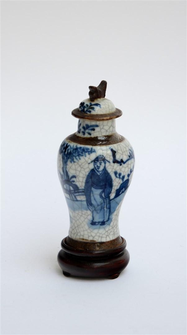 Piccolo vaso con coperchio in porcellana su fondo craquelè. Marchio apocrifo alla base, base in legno (h cm 15) Cina, sec. XX (lievi difetti)