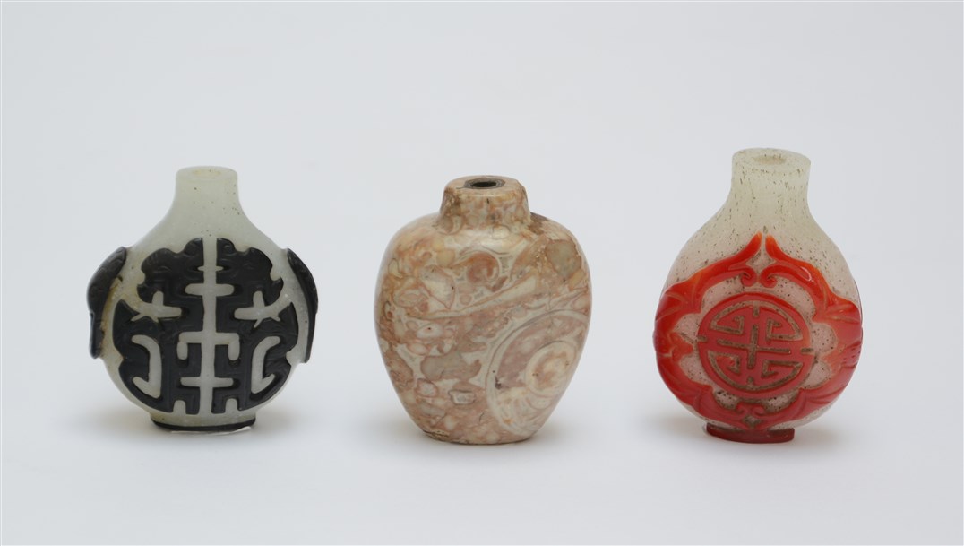 Lot 58 | Tre snuff bottle in pietra dura e vetro di decoro diverso (mancanza dei tappi...