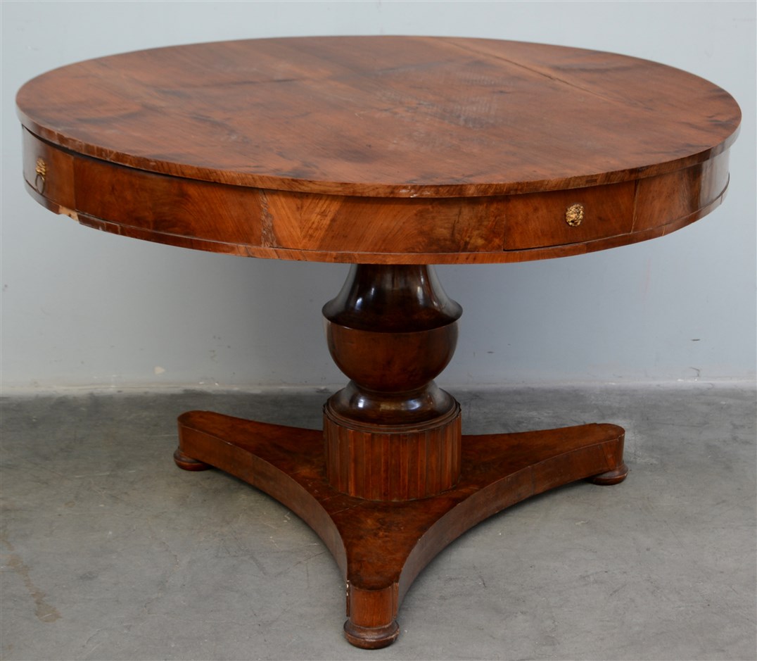 Tavolo tondo a quattro cassetti poggiante su gamba centrale a colonna terminante a mensola tripode. Secolo XIX (diam. cm 119